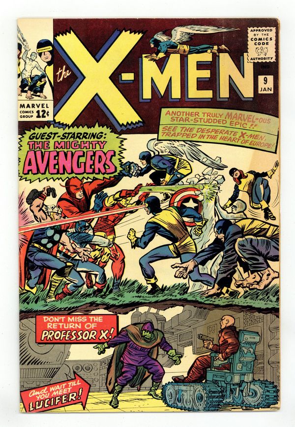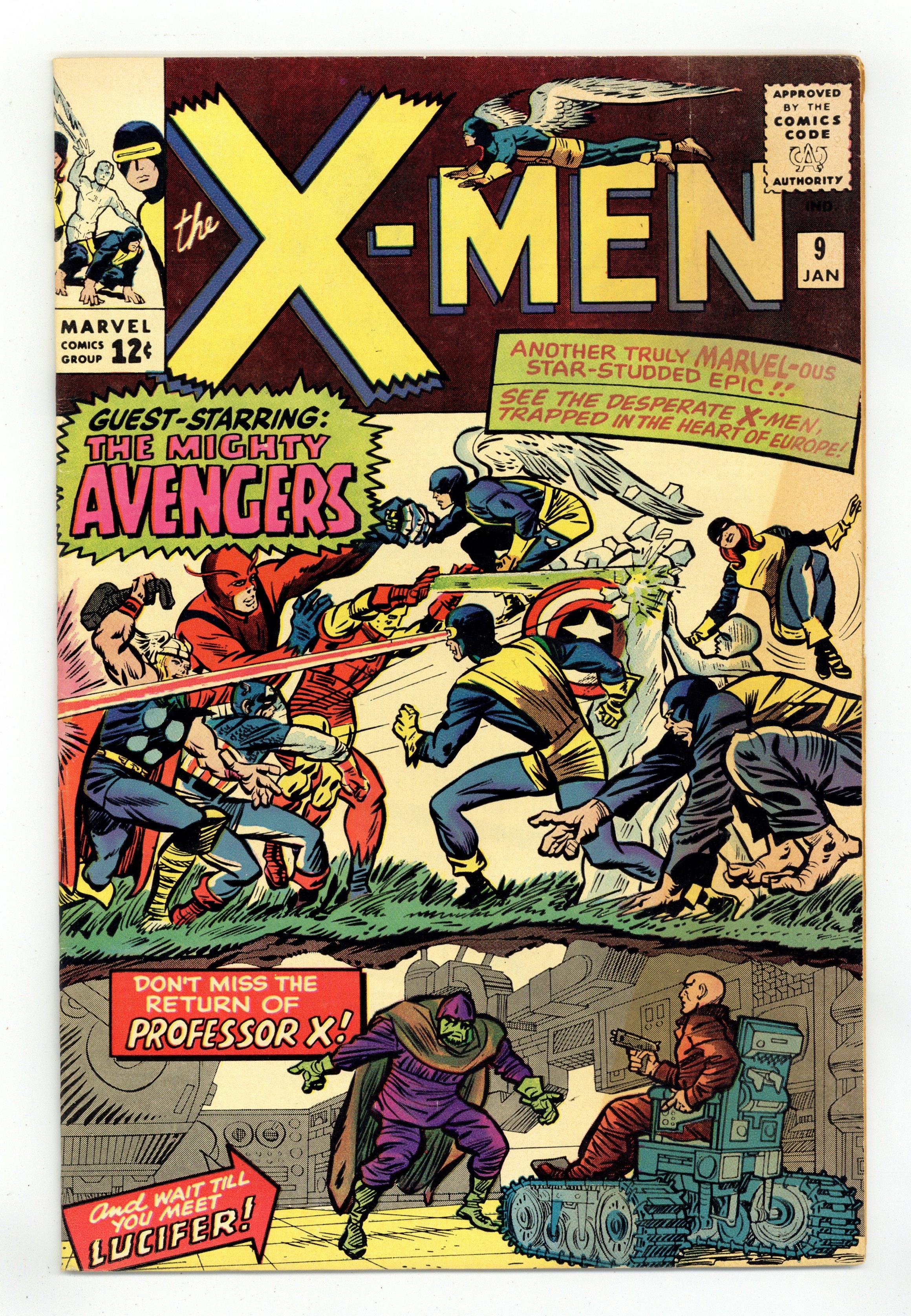 "Enter, The Avengers!" Script by Stan Lee, pencils and cover by Jack Kirby with inks by Chic Stone. 1st meeting of X-Men and the Avengers, 1st appearance of Lucifer. Also features a Marvel Girl "Marvel Masterwork" pin-up with pencils by Kirby and inks by Chic Stone. 36 pgs. Cover price $0.12. Grade: VG 4.0 explanation of grade Condition: Used (collectible)