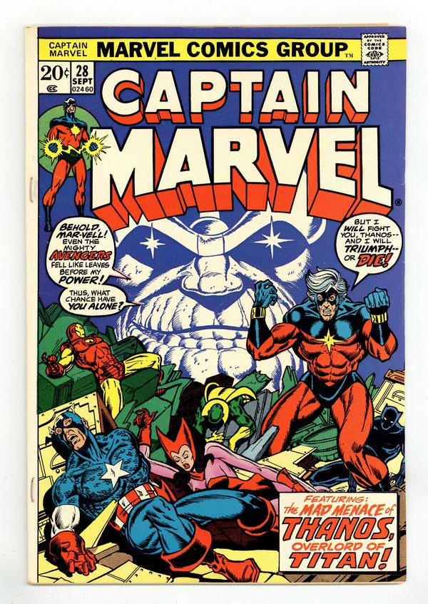 Ended Apr 18 2023 Winning Bid $26 Thanos defeats Drax the Destroyer and obtains the Cosmic Cube--and that can't be a good thing! The Avengers (Captain America, Iron Man, the Scarlet Witch, the Vision, and the Black Panther) guest star in "When Titans Collide!" Plot, pencils, and script (chapter 2) by Jim Starlin, script (chapters 1 and 3) by Mike Friedrich, inks by Dan Green. (Splash page art retouches by John Romita Sr.). Captain Marvel battles the Controller. Drax the Destroyer appearance. Starlin cover pencils. Cover price $0.20. Grade: VG/FN 5.0 explanation of grade Condition: Used (collectible)