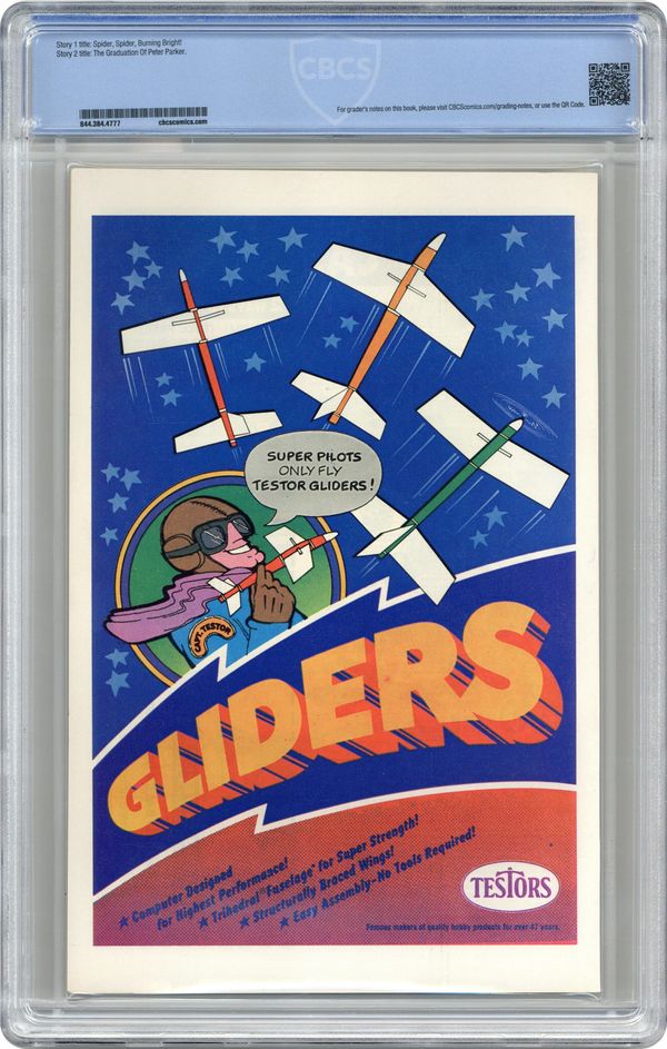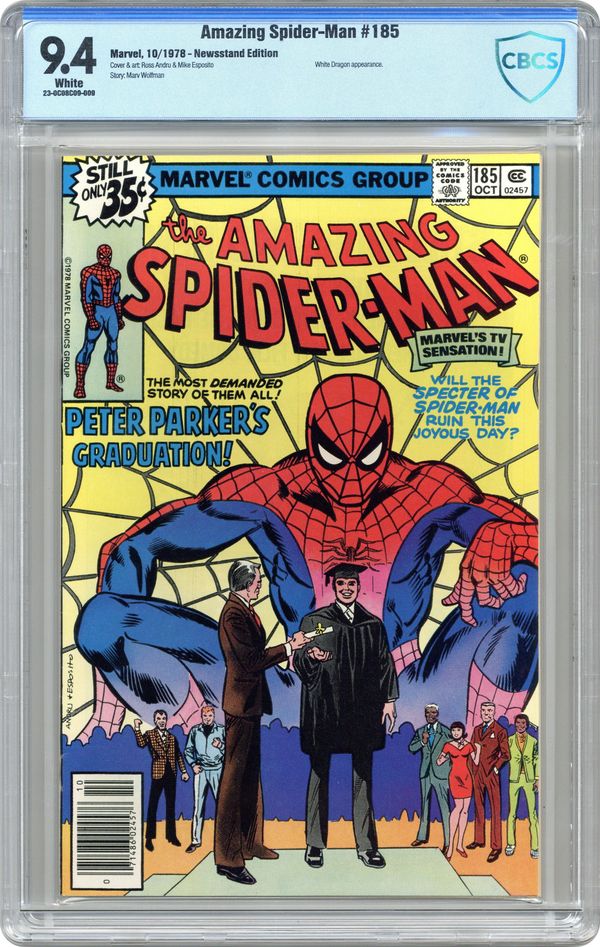 "Spider, Spider, Burning Bright!" Part 2 of 2. Script by Marv Wolfman. Pencils by Ross Andru. Inks by Mike Esposito. Cover by Ross Andru and Mike Esposito. The Spectacular Spider-Man is on fire in Chinatown! And hurtling towards the East River to save his life! Thankfully, the murky waters extinguish the flames and give the wall-crawler a chance to regroup! The following night the web-slinger returns to the Lower East Side to battle the White Dragon again! Will the way of the spider or the way of the (white) dragon prevail? Second story: At long last Peter Parker's graduation day from Empire State University is here! But Peter may want to check one more time with the registrars office...before walking across the stage! Cameo appearances by J. Jonah Jameson, Flash Thompson, Harry Osborn, Betty Brant, Joe Robertson, and Aunt May. (Notes: The White Dragon appears next in Marvel Team-Up 144. This issue concludes Ross Andru's remarkable 5-year run as the penciler of the Amazing Spider-Man series -- highlighted by the original clone saga and the creations of the Punisher, Jackal, and Tarantula.) 36 pages. Cover price $0.35. Grade: CBCS 9.4 explanation of grade Condition: Used (collectible)