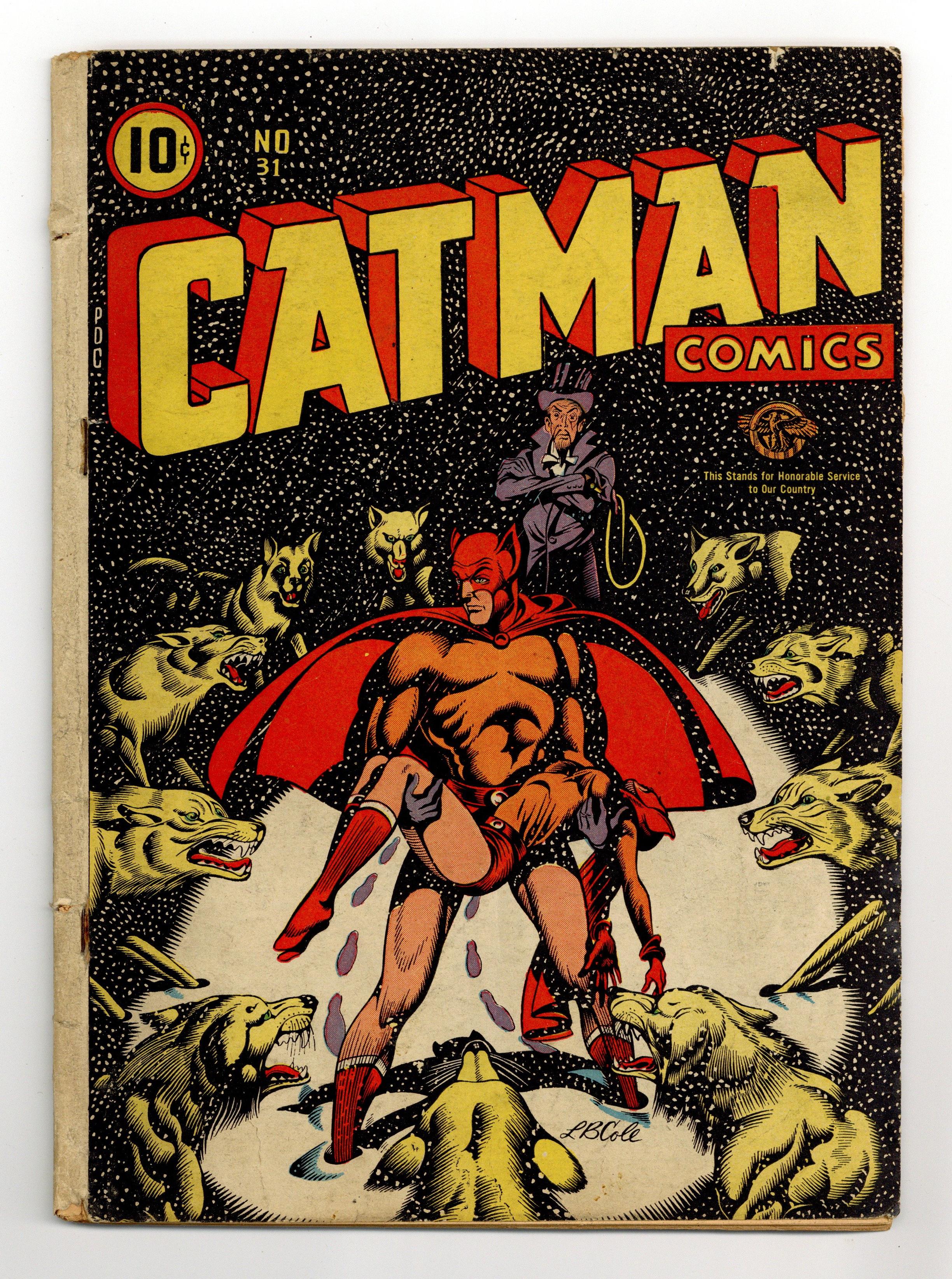 Cover by L. B. Cole. Stories and art by Jay Henry, Fred Morgan, Nina Albright, Maurice Whitman, George Gregg and Rudy Palais. The adventures of Cat-Man and other early superheroes from the Golden Age of comics. Dr. Macabre's latest hypnotic serum allows him to put Kitten under his power. Molly O'Moore and Scoop Scanlon investigate a 50-year-old murder and find a ghost in a wedding gown. Jim Braden leads an expedition to Africa, in a strange story involving "giant pygmies" and a monster-sized elephant. Cat-Man; The Deacon; Molly O'Moore and Scoop Scanlon; Fire! Fire!; Pigmy Peril; Golden Archer; The Reckoner; Little Leaders. 52 pages, Full Color. Cover price $0.10. Grade: GD+ 2.5 explanation of grade Condition: Used (collectible)