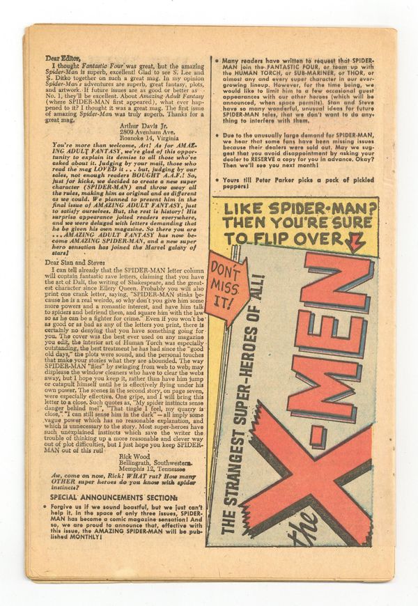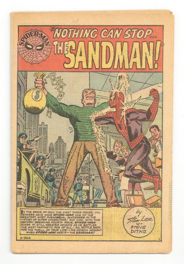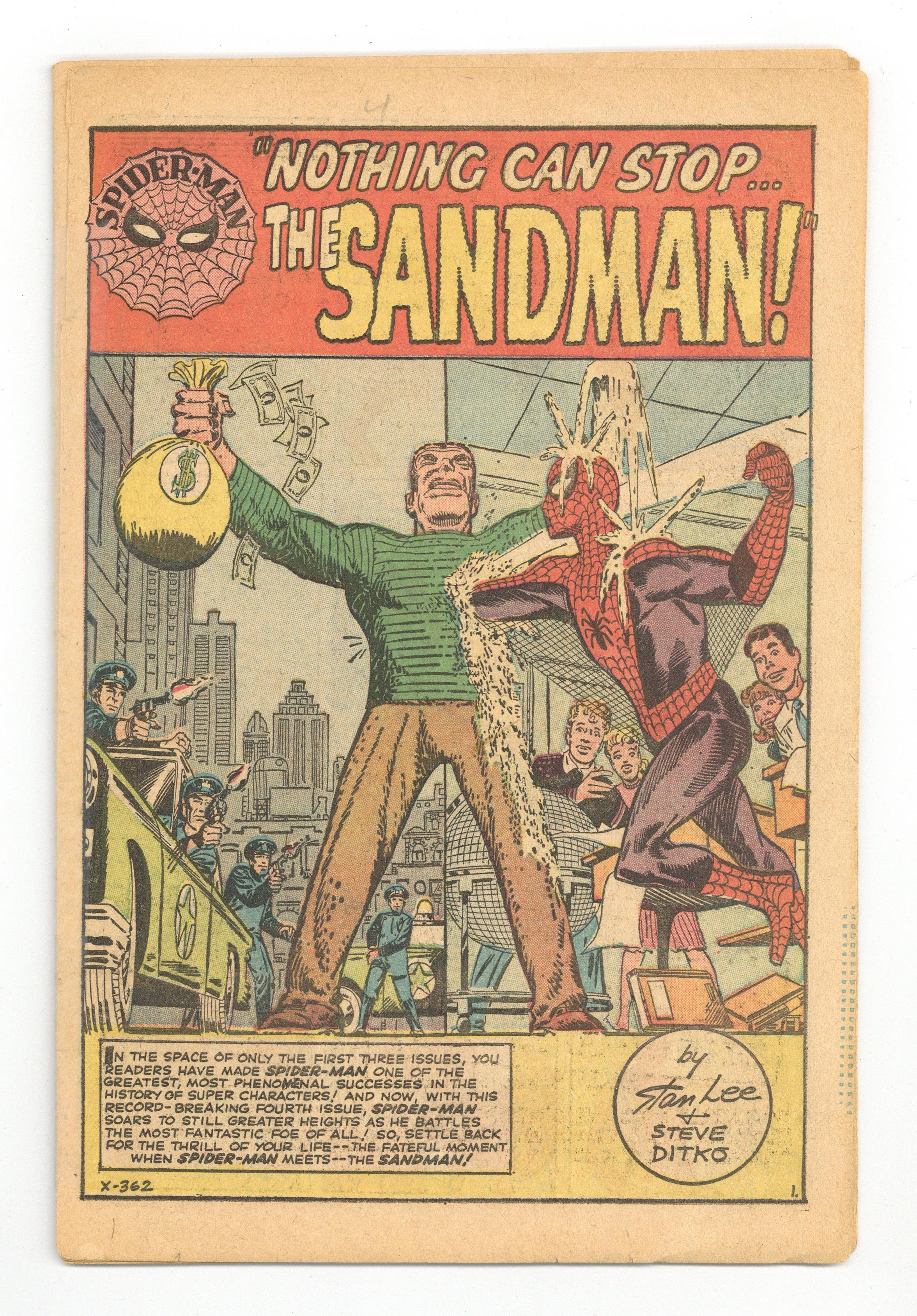Cover art by Steve Ditko. First appearance of the Sandman in Nothing Can Stop The Sandman!, script by Stan Lee, art by Steve Ditko; The Sandman tries to hide from police in the high school where Peter Parker goes to school. Intro Betty Brant and Liz Allen. Reprinted in Marvel Tales # 141. 36 pgs. $0.12. Cover price $0.12. Grade: Coverless explanation of grade Condition: Used (collectible)