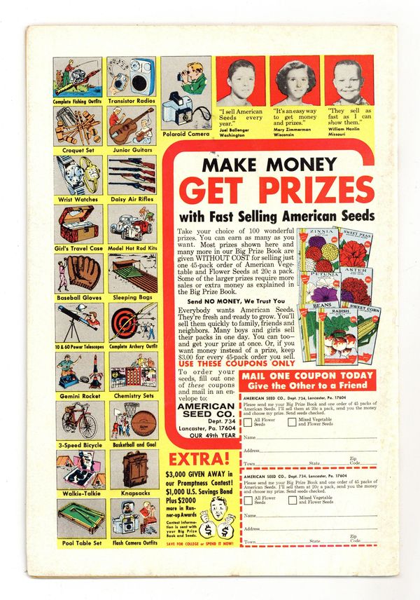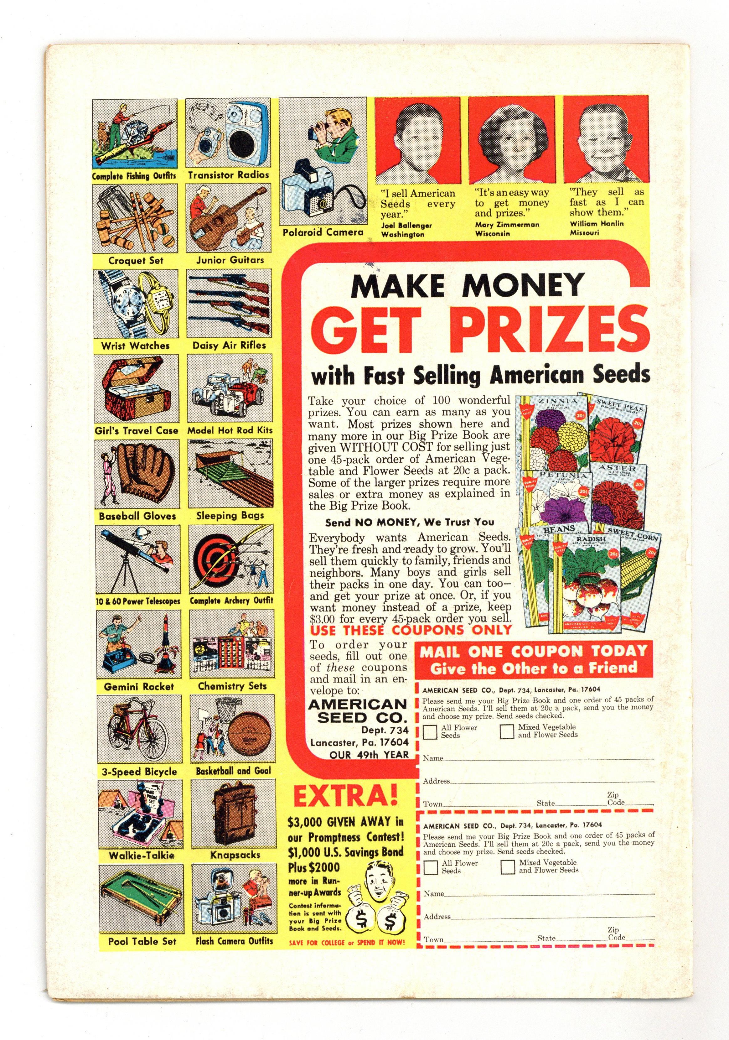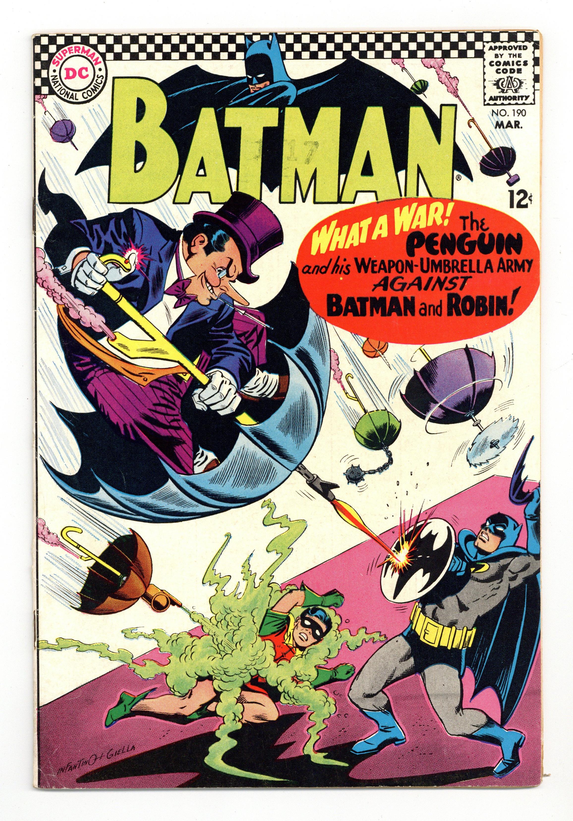Cover pencils by Carmine Infantino, inks by Joe Giella. "The Penguin Takes a Flyer--Into the Future!", script by Gardner Fox, pencils by Sheldon Moldoff (as Bob Kane), inks by Joe Giella; Penguin attempts to fool the Caped Crusaders into believing that his new tricks are based on futuristic technology. When this fails and his gang is captured the Fowl villain begins using robotic umbrellas against the Dynamic Duo. Letters from letter hack Guy H. Lillian III and Marvel colorist and assistant editor Irene Vartanoff. Cap's Hobby Hints activity half-page by Henry Boltinoff. Countdown on Excellence public service, script by Jack Schiff, art by Sheldon Moldoff; Jerry gets a lecture from his father on the importance of doing every job right. 36 Pages, Full Color. Cover price $0.25. Grade: FN- 5.5 explanation of grade Condition: Used (collectible)