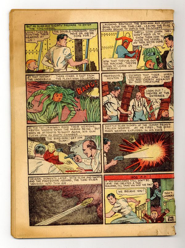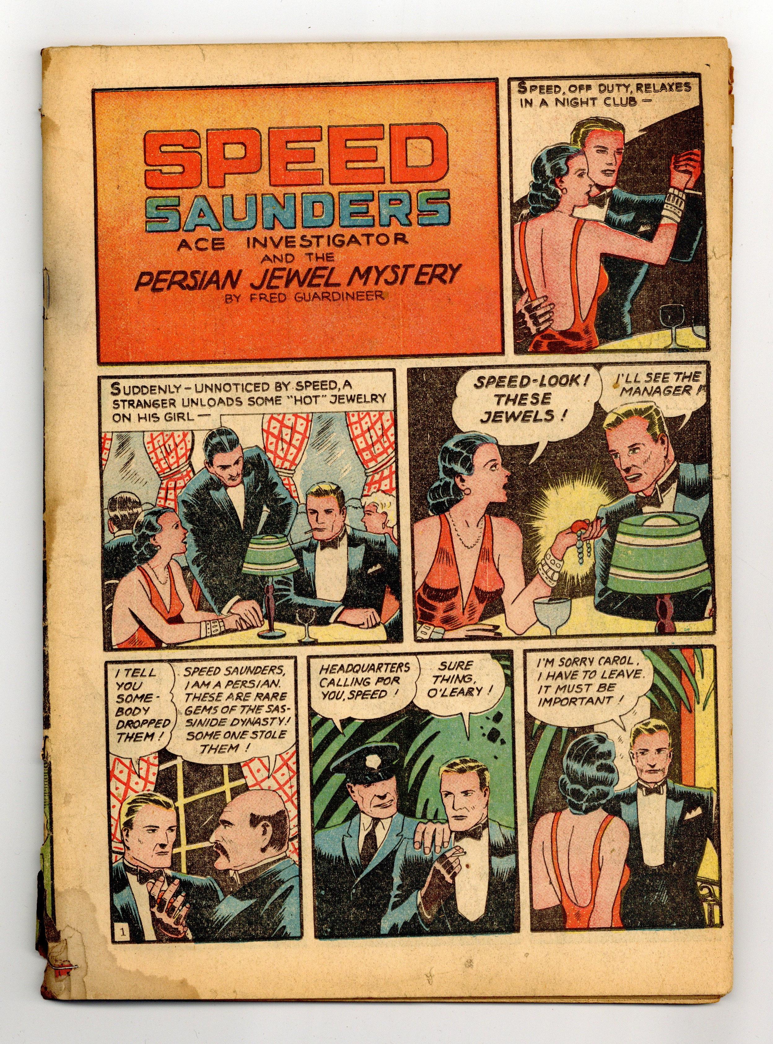 Cover art by Fred Guardineer. Cleo and Clancy humor page by Bob Kane. The Persian Jewel Mystery starring Speed Saunders, script by Gardner Fox, art by Fred Guardineer. Oscar the Gumshoe humor page by Bob Kane. Larry Steele story, script and art by Will Ely. Cosmo story, art by Sven Elven. Spy story, script by Jerry Siegel, art by the Shuster Shop. Dr. Fu Manchu story, script by Sax Rohmer, art by Leo O'Mealia. The Old Grey House text story by Terry Keane. Crimson Avenger story, art by Jim Chambers. Back From the Dead (Part 1) starring Bruce Nelson, art by Tom Hickey. Paper Trail starring Buck Marshall, script and art by Homer Fleming. Slam Bradley story, script by Jerry Siegel, art by the Shuster Shop. 68 pgs. $0.10. Cover price $0.10. Grade: Coverless explanation of grade Condition: Used (collectible)