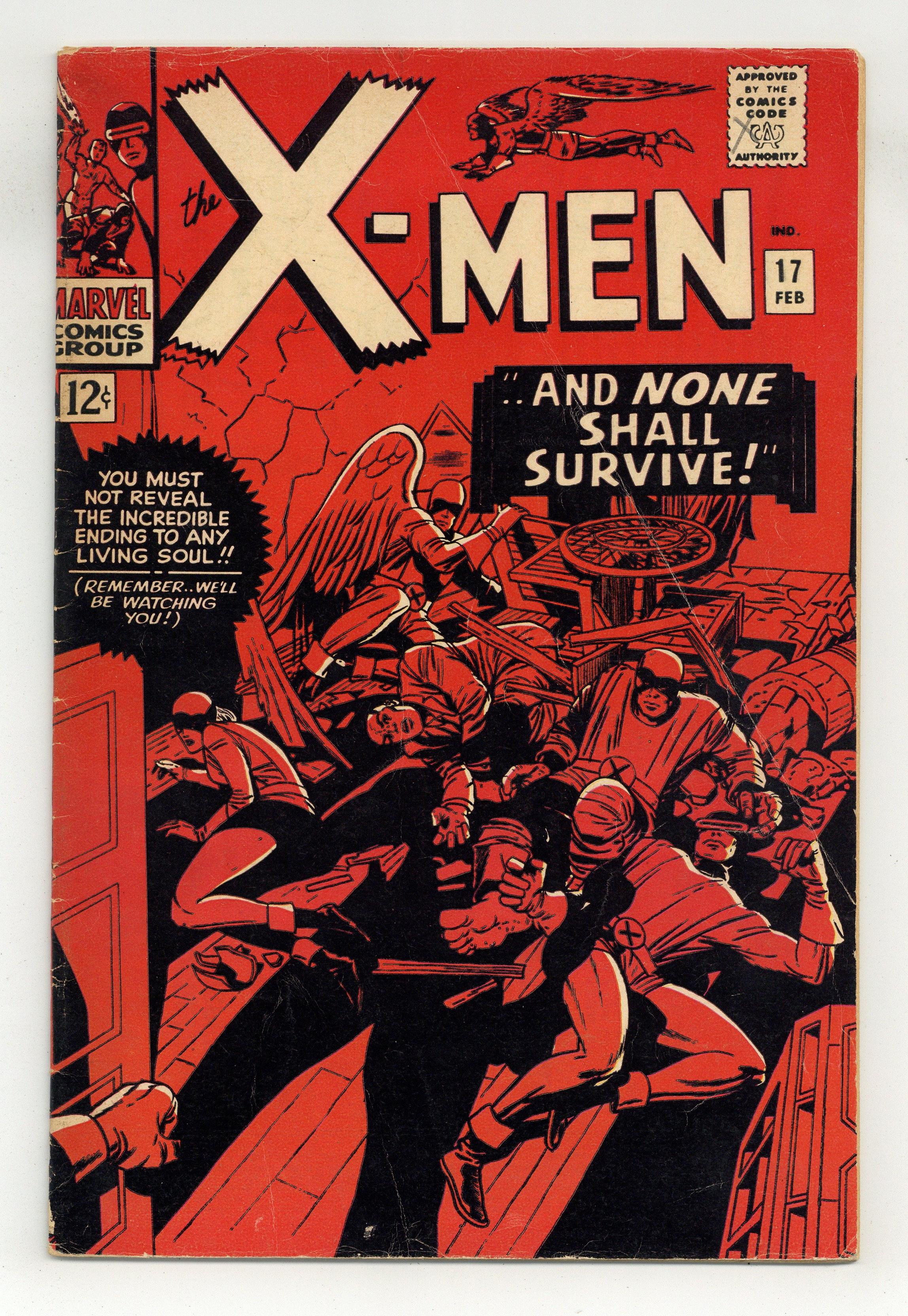 Cover pencils by Jack Kirby, inks by Dick Ayers. ...And None Shall Survive!, script by Stan Lee, pencils by Jack Kirby (p. 1 & layouts, pp. 2–20) and Werner Roth [as Jay Gavin] (pp. 2–20), inks by Dick Ayers; In the aftermath of their battle with the Sentinels, Hank, Bobby and Scott are taken to the hospital with injuries; Iceman is delirious in a coma but his companions recover quickly; When Warren's parents call and say they are dropping by for a visit, Angel flies back to the mansion where he is attacked by a mysterious stranger; Xavier and Cyclops, worried with no word from Angel, also return home and are attacked; Beast and Jean are the last to show up and are also taken down; As Warren's parents arrive at the mansion, they are greeted by Magneto. 36 pgs. $0.12. Cover price $0.12. Grade: VG- 3.5 explanation of grade Condition: Used (collectible)