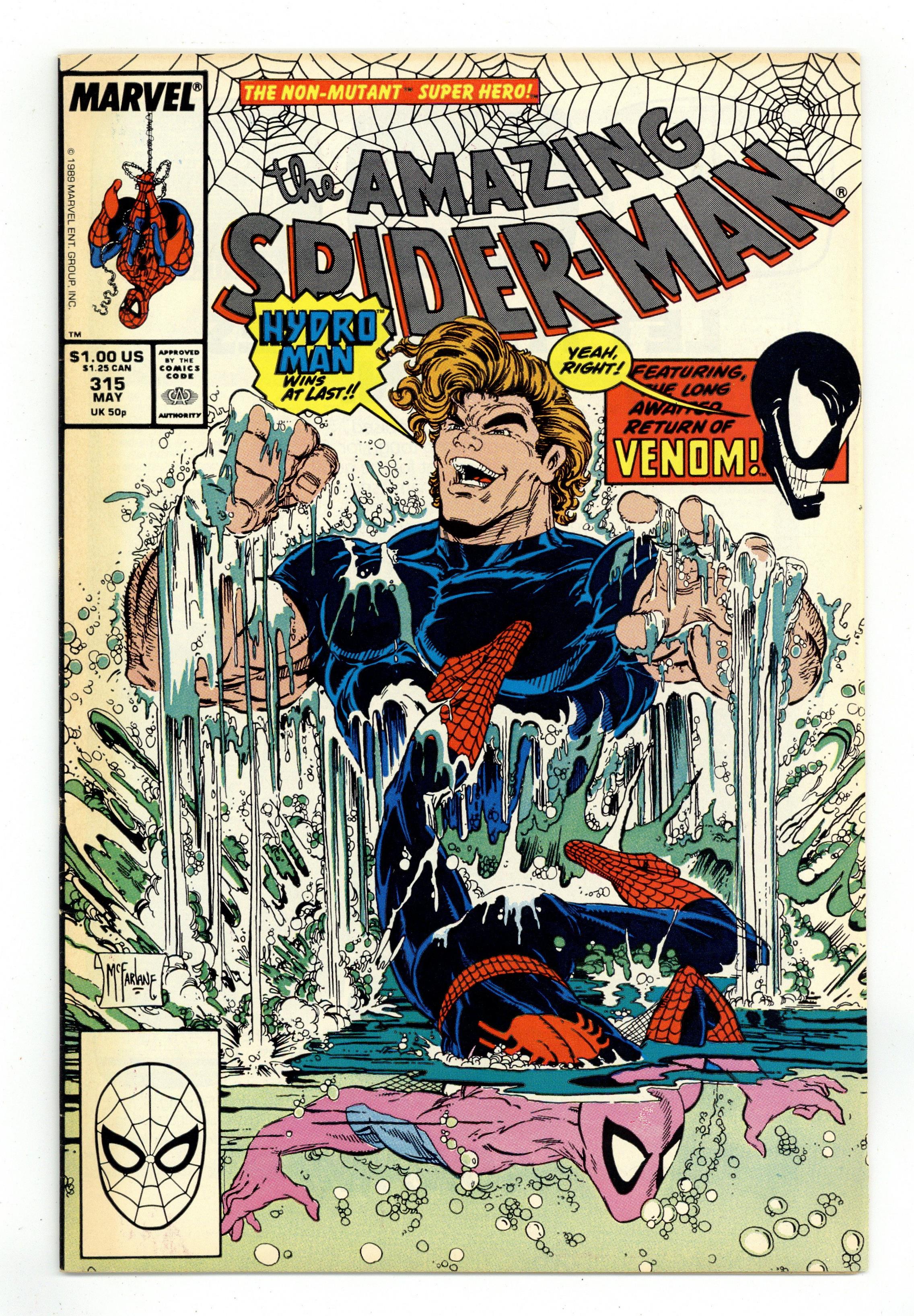 Direct Edition. "A Matter of Life and Debt!" Script by David Michelinie. Art by Todd McFarlane. Cover by Todd McFarlane. Life is full of challenges and on this day Peter Parker and his web-spinning alter-ego face three! The first, Hydro-Man attempts a payday robbery! But the Spectacular Spider-Man stops the heist! The second, Nathan Lubensky steals money from Aunt May to pay his gambling debts! However, Peter quickly shuts down his operation! And the fateful third...Venom escapes from the Vault! Wow, this challenge will be more difficult and more deadly starting next issue! Cameo appearances by Mary Jane Watson and Kristy Watson. (Notes: Venom previously appeared in Amazing Spider-Man 300.) The letters page contains a statement of ownership: average print run 451,930; average paid circulation 271,100. 36 pgs. Cover price $1.00. Grade: FN 6.0 explanation of grade Condition: Used (collectible)