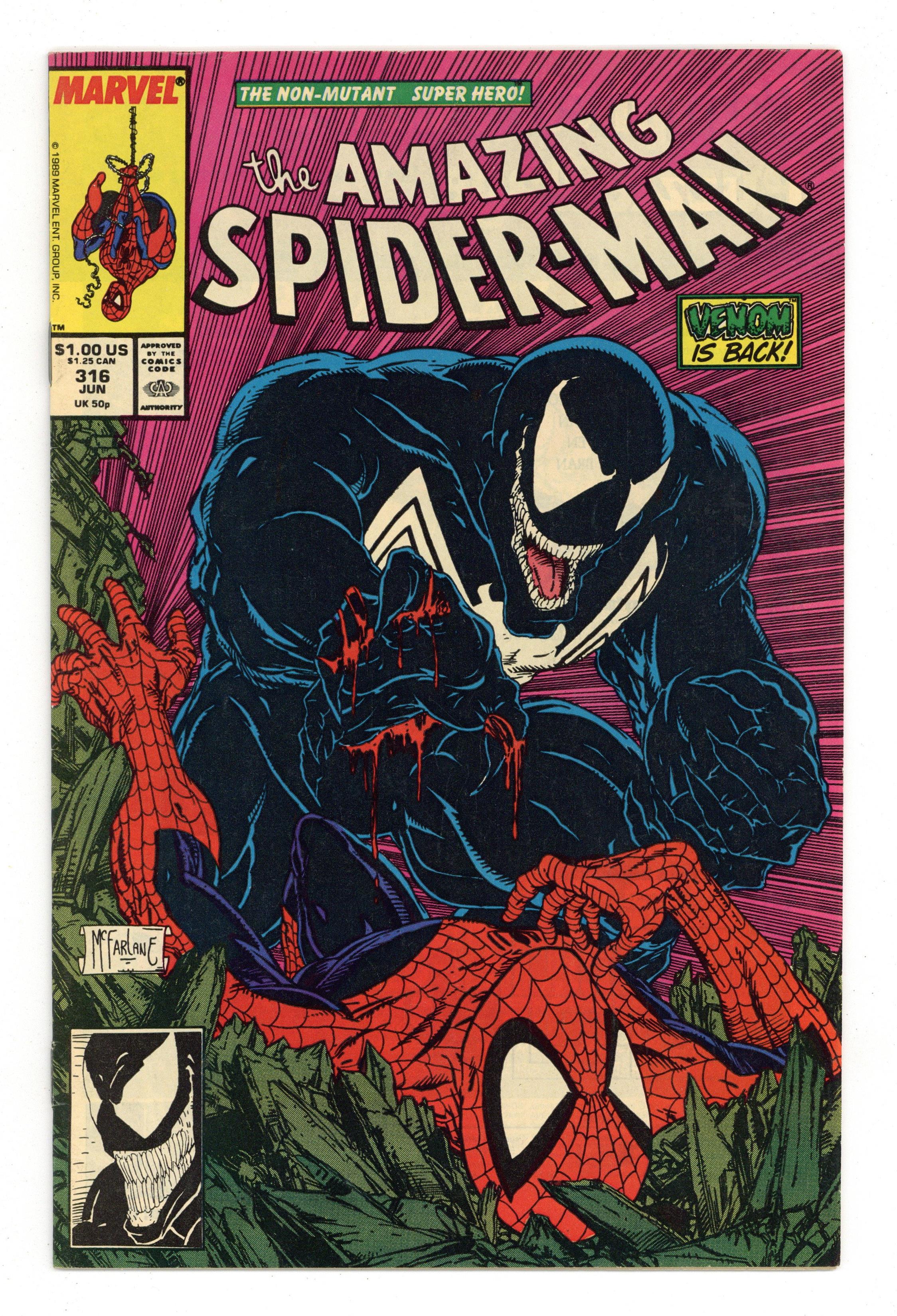 Direct Edition. "Dead Meat" Part 1 of 2. Script by David Michelinie. Art by Todd McFarlane. Cover by Todd McFarlane. Venom is back in New York City! And the deranged Eddie Brock is looking to kill Peter Parker or Spider-Man with extreme prejudice! However, first the psychotic symbiote has to find where the Parkers are living! At the web-slinger's former Bedford Towers residence, Venom runs into and then runs roughshod over the Black Cat! But Felicia doesn't know where the wall-crawler is either! Later on Peter learns that his worst nightmare has returned and his family is in grave danger. Spider-Man can't wait for Venom to make the first move. The web-slinger must attack! Cameo appearances by Aunt May, Glory Grant, and Eduardo Lobo. (Note: This two-part story was reprinted in 1990 in the trade paperback: Spider-Man vs. Venom.) 36 pages. Cover price $1.00. Grade: VG/FN 5.0 explanation of grade Condition: Used (collectible)