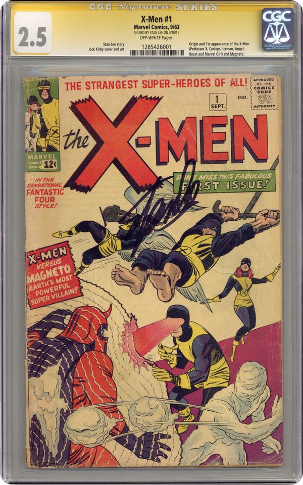 Cover pencils by Jack Kirby, inks by Sol Brodsky. X-Men, script by Stan Lee, pencils by Jack Kirby, inks by Paul Reinman; After a day of training and meeting Jean Grey, a new student at Professor X's school, the X-Men go one their first assignment--stopping a mutant named Magneto from talking over an Air Force base. Full page house ads for Amazing Spider-Man #4 and Sgt. Fury and His Howling Commandos #3. This is it, the first issue of the Uncanny X-Men, and even in the beginning, there was Magneto, the Earth's most powerful super villain. Conceived by Stan Lee and Jack Kirby, this first issue will always remain one of the core books within the Marvel Comics mythos. This is Stan and Jack making history and legend, although no one knew it at the time. First appearances of Professor X, Cyclops, Iceman, the Angel, the Beast, Marvel Girl, and Magneto. 36 pgs. $0.12. Cover price $0.12. Grade: CGC 2.5 explanation of grade Condition: Used (collectible)