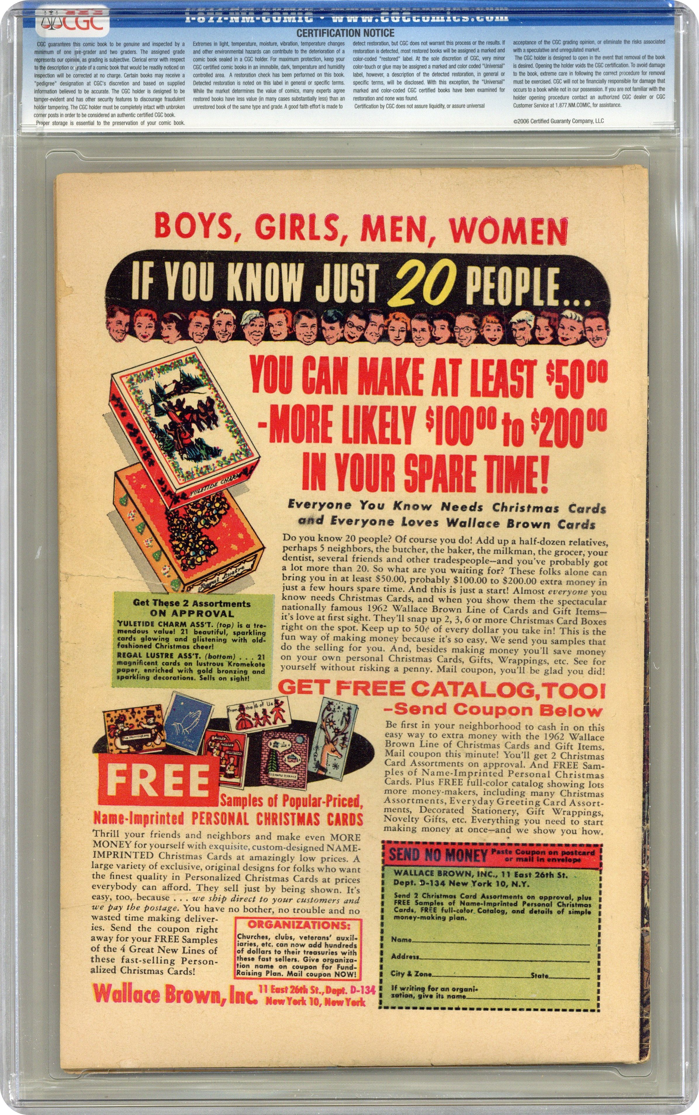 Ended Jan 18 2024 Winning Bid $510 Cover pencils by Jack Kirby, inks by Joe Sinnott. Second appearance of Thor and first appearance of Jane Foster (called "Jane Nelson") in "The Mighty Thor vs. the Executioner!"; Plot by Stan Lee, script by Larry Lieber, pencils by Jack Kirby, inks by Dick Ayers; Dr. Blake joins a medical mission to a South American country wracked with civil war. The leader of the communist faction - the Executioner - orders an attack on the doctors, and Blake must use the power of Thor to save his colleagues and defeat the communists; The Executioner in this story is not the same character who will appear in issue 103. "The Recipe" text story. "The Witching Hour!", script by Stan Lee, art by Don Heck; A criminal flees to a foreign country, where people still believe in witches; He convinces a woman that he meets on the train to pretend to be a witch so that he can extort money from villagers as a fake witch hunter. "Somewhere Hides a...Thing!", script by Stan Lee, art by Steve Ditko; A dying man in the Arctic claims that he saw an alien land; His friends search for alien, but they dont realize that an iceberg is its disguised space ship, and think it was a hallucination. 36 pgs., full color. $0.12. Cover price $0.12. Grade: CGC 3.0 explanation of grade Condition: Used (collectible)