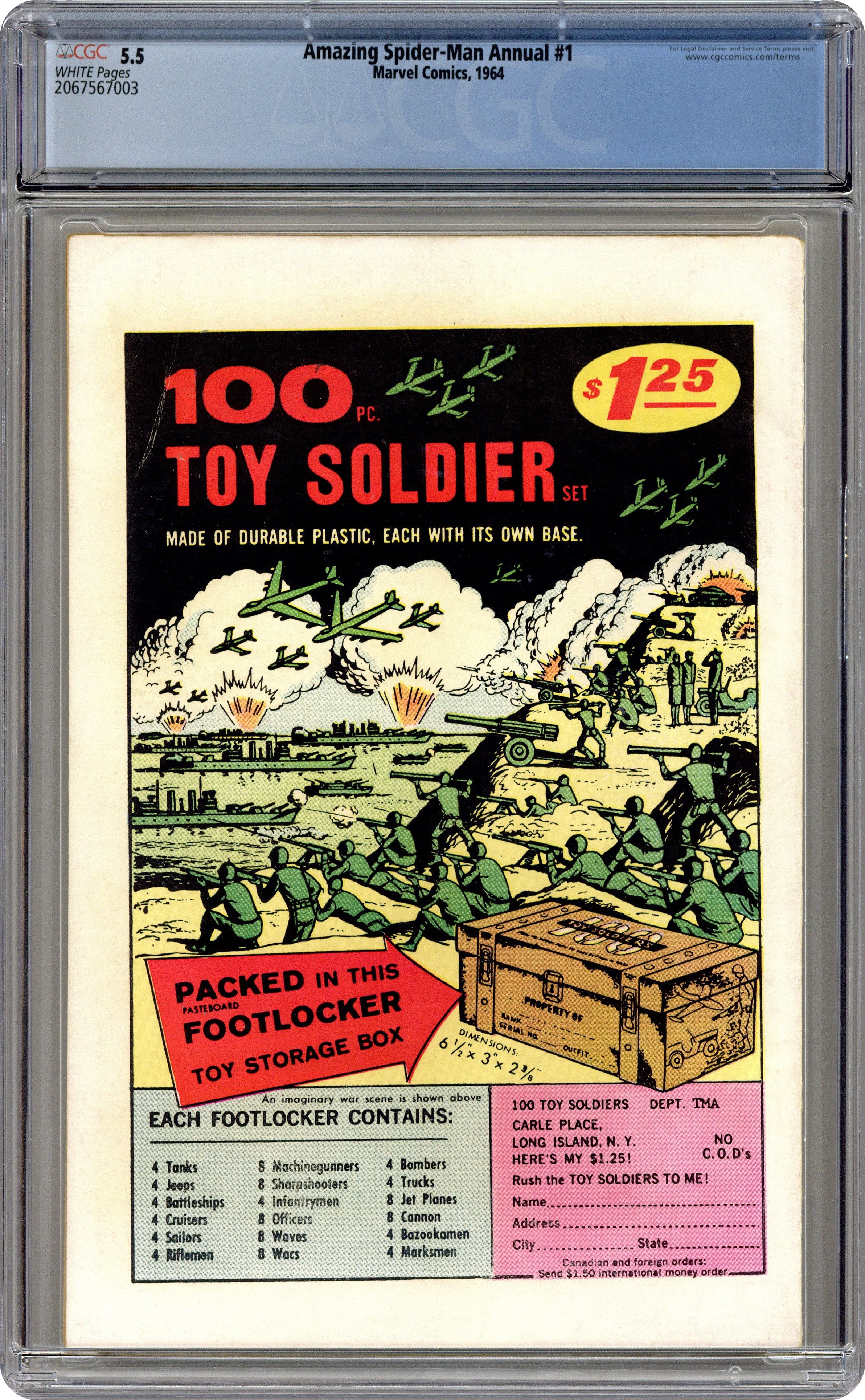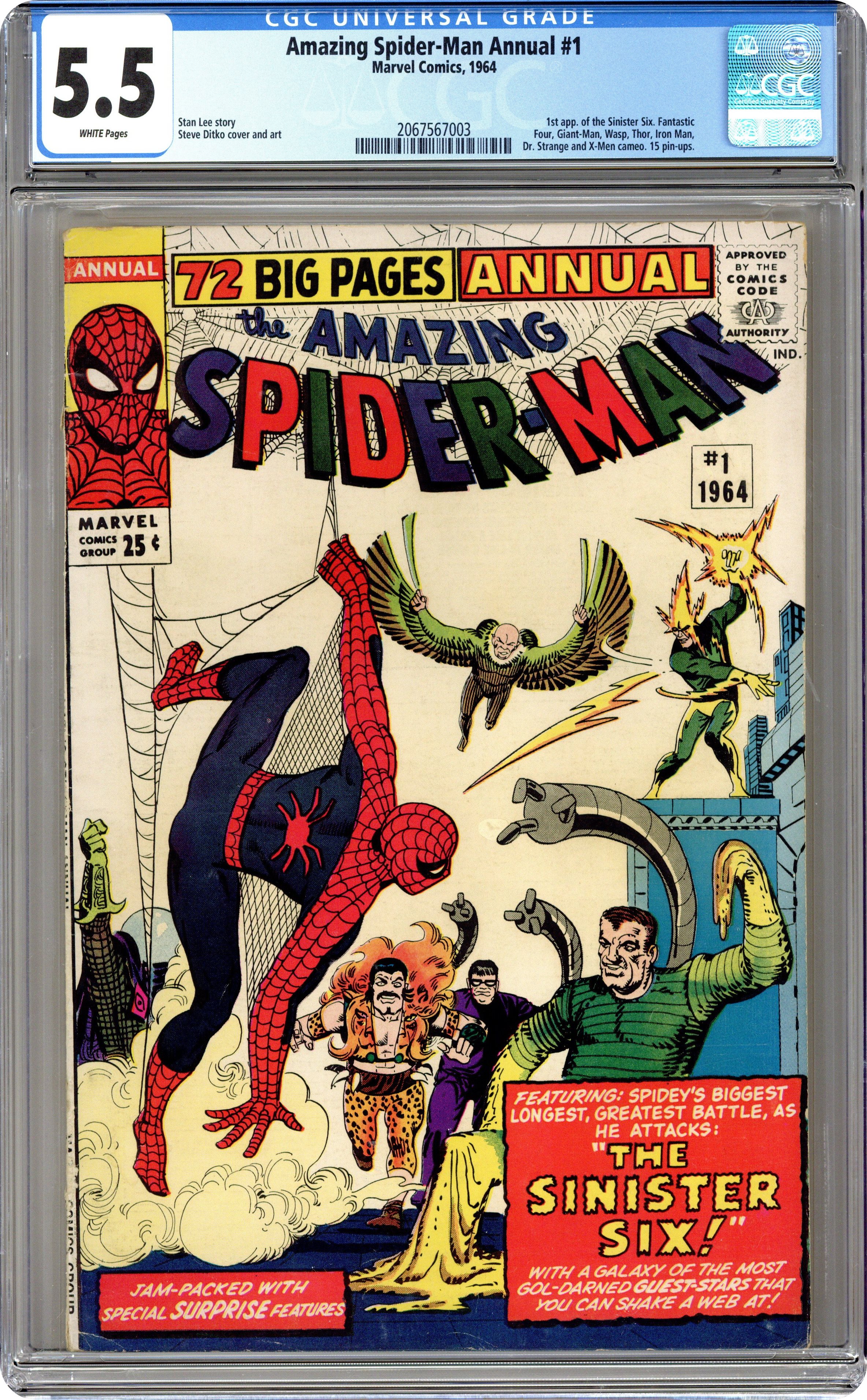 Cover art by Steve Ditko. First appearance of the Sinister Six (Doctor Octopus, Electro, Kraven the Hunter, Mysterio, Sandman, and the Vulture) in a new 41-page story, "The Sinister Six!" Script by Stan Lee, art by Steve Ditko; Dr. Octopus organizes the Sinister Six, composed of other Spider-Man Villains; They capture Betty Brant and Aunt May and force Spider-Man to rescue them. Cameos by the X-Men, the Fantastic Four, Captain America, Thor, Iron Man, Iron Man, Giant Man, and the Wasp. Lots of back-up features (all art by Ditko): 14 pages of pin-ups (Spider-Man's most famous foes); 9-page "The Secrets of Spider-Man"; 3-page "How Stan Lee and Steve Ditko Create Spider-Man!"; and other miscellaneous pin-ups. Giant 76-page issue! Most of this issue reprinted in Marvel Tales # 150. 76 pgs., full color. Cover price $0.25. Grade: CGC 5.5 explanation of grade Condition: Used (collectible)