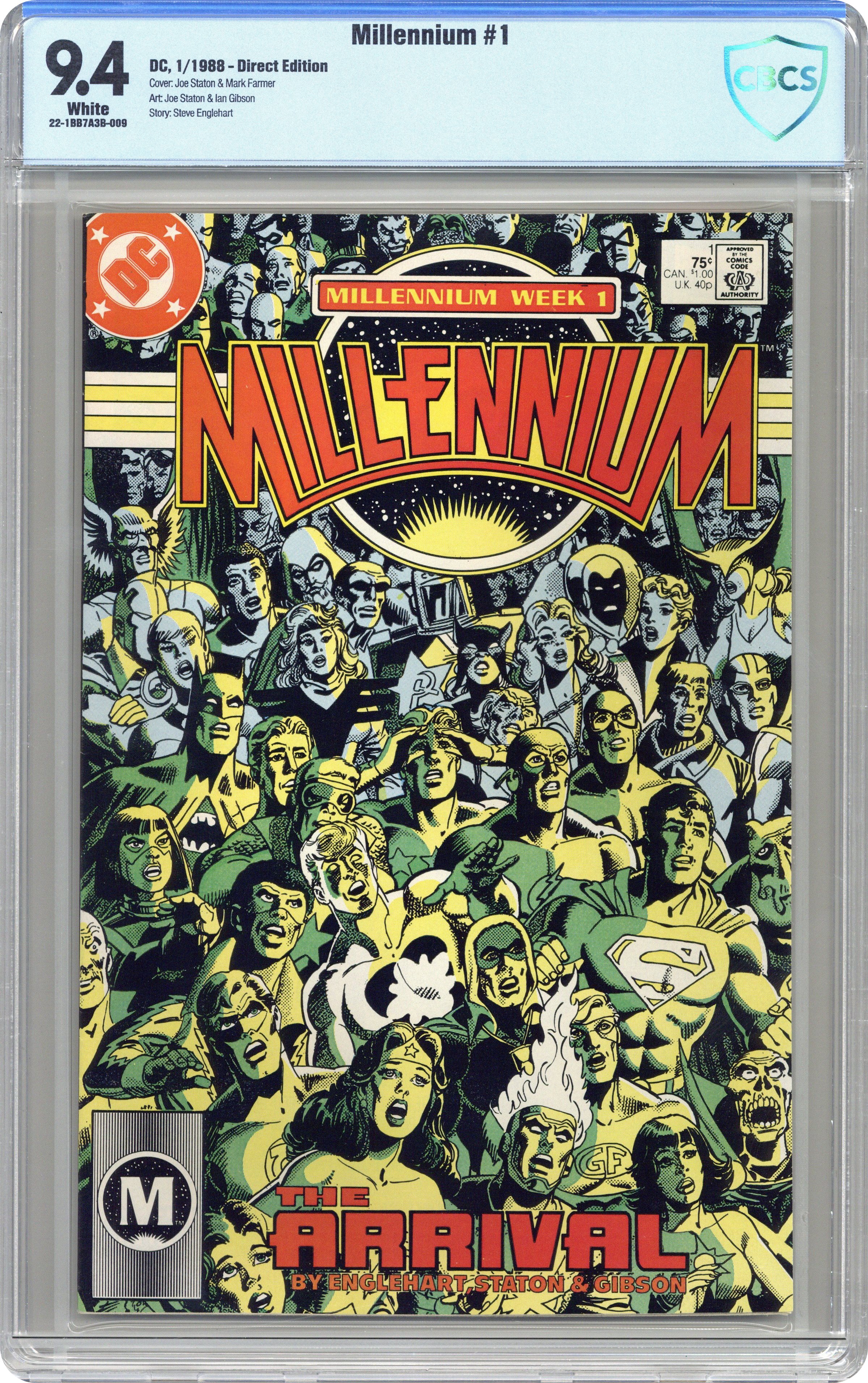 Ended Feb 5 2024 Winning Bid $12 Millennium Week 1. Week one of DC's companywide crossover of 1987 gets underway by informing readers that the Manhunters were created as a force for good three-and-a-half billion years ago by the Guardians of the Universe. However, they have turned against their masters and are now gunning for Earth's heroes and for ten special "chosen ones" that have been selected by the Guardians. Various DC characters, such as Wally West's dad, are revealed to be Manhunters. Written by Steve Englehart, with layouts by Joe Staton and finishes by Ian Gibson. Cover price $0.75. Grade: CBCS 9.4 explanation of grade Condition: Used (collectible)