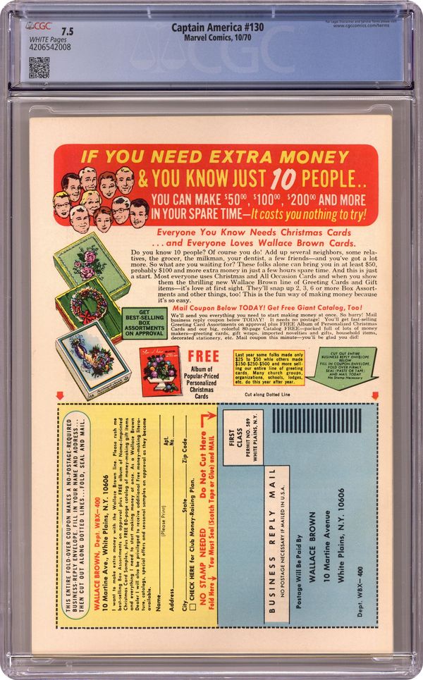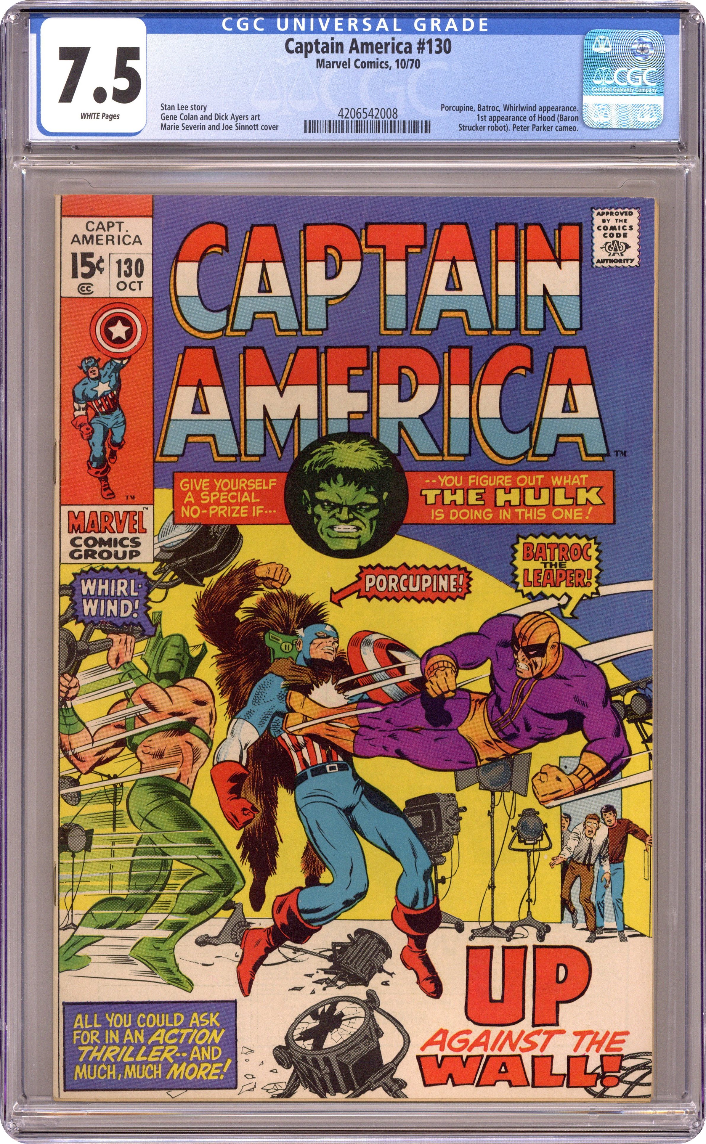 Cover pencils by Marie Severin, inks by Joe Sinnott. Batroc, Whirlwind, and Porcupine team up against Captain America in "Up Against the Wall," script by Stan Lee, pencils by Gene Colan, inks by Dick Ayers; Captain America stumbles onto the Hood's plan to convince students to riot at a Midwestern university; After rescuing a dean from said riot, Cap is asked to make public service announcement condemning the students; While he mentions that violence shouldn't be the answer, Cap mostly condemns the dean; The Hood hires Batroc's Brigade to attack Cap. Cameos by the Hulk and Peter Parker (Spider-Man). 36 pgs., full color. $0.15. Cover price $0.15. Grade: CGC 7.5 explanation of grade Condition: Used (collectible)