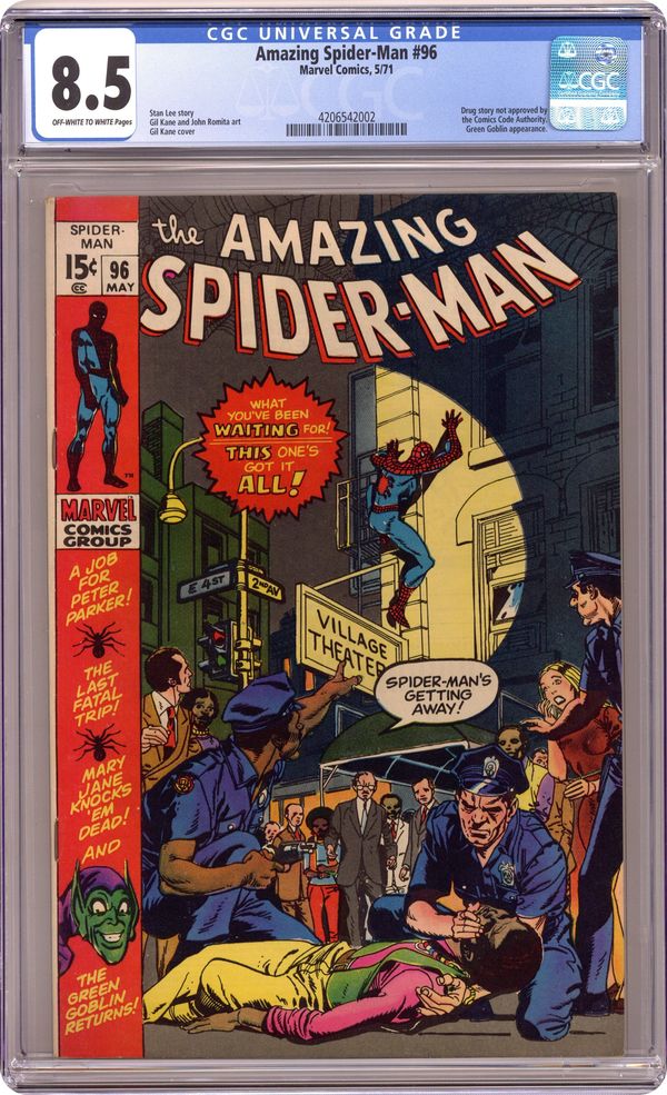 Not approved by the Comics Code Authority (see notes). "And Now, the Goblin!" Part 1 of 3. Script by Stan Lee. Pencils by Gil Kane. Inks by John Romita. Cover by Gil Kane. With Gwen Stacy still in London, Peter Parker gains a new admirer: Mary Jane Watson. Oh boy. How will MaryJane's sudden interest in Peter affect Harry Osborn? Unfortunately, the short answer is not well. Since Harry is secretly battling a drug addiction. Nevertheless, when Mary Jane makes her off-Broadway debut at a local theater; Peter and Harry attend the show to support her. Interestingly, Norman Osborn also attends the musical. In part because he used to own the building that now houses the theater. During the show Norman fixates on a certain door -- possibly a storage room door -- just off the main hallway. And Peter notices it too. After the show the web-slinger returns to the theater...and discovers his worst nightmare in the flesh: the Green Goblin! Wow! Cameo appearances by Joe Robertson and Randy Robertson. (Notes: This three-part story was not approved by the CCA due to the (anti)drug-themed story. At this time the code did not permit drugs to be mentioned in any fashion. However, Stan Lee published the story anyway, and it led to major revisions in the code -- allowing anti-drug stories and horror stories including ones about vampires. The Green Goblin previously appeared in the Spectacular Spider-Man Magazine (1966) #2. Marie Severin provided the layout for the cover. This issue was reprinted in Marvel Tales #77.) 36 pages. Cover price $0.15. Grade: CGC 8.5 explanation of grade Condition: Used (collectible)