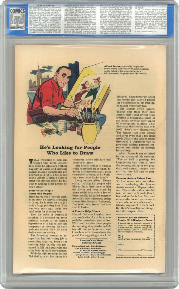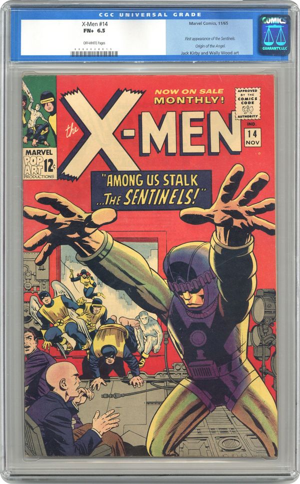 Cover pencils by Jack Kirby, inks by Wally Wood. Among Us Stalk...The Sentinels!, script by Stan Lee, pencils by Jack Kirby (layouts) and Werner Roth [as Jay Gavin] (pencils), inks by Vince Colletta; After their battle with the Juggernaut, Xavier sends the X-Men on vacation; Reading a story in the paper about Dr. Trask and his story on the mutant menace, Professor X calls for a televised debate with the anthropologist; During the broadcast, Trask unveils his Sentinels, robots who were built to capture and nullify mutants, but things quickly get out of hand as the Sentinels proclaim themselves superior to puny humans and prepare to take over; Xavier calls his X-Men to help and they return to battle the Sentinels; When one of their number falls, the giant robots capture Trask and return to their base; The X-Men follow and find a hidden complex complete with devastating weaponry aimed directly at them; 1st appearance of the Sentinels. 36 pgs. $0.12. Cover price $0.12. Grade: CGC 6.5 explanation of grade Condition: Used (collectible)