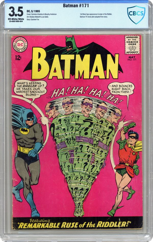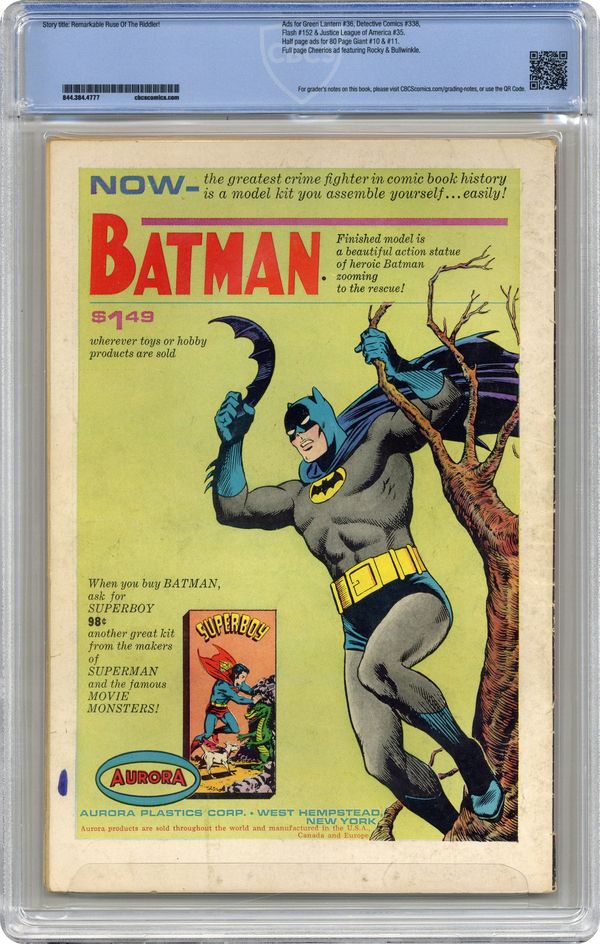 Ended May 4 2024 Winning Bid $356 1st Silver Age Riddler appearance (the question-marked criminal hadn't appeared in a Batman book since 1948). Cover pencils by Carmine Infantino, inks by Murphy Anderson. What's Wrong with These Pictures! public service announcement, art by Bernard Baily. "Remarkable Ruse of the Riddler!" (the Batman TV pilot was based on this story), script by Gardner Fox, pencils by Sheldon Moldoff (as Bob Kane), inks by Joe Giella; The Riddler is released from prison and informs the Dynamic Duo that he has turned from crime, and, as proof, leads them to the hideout of the Molehill Mob; But when the former felon begins deluging them with riddles, the Caped Crusaders aren't sure he really has reformed. Rocky and Bullwinkle star in a one-page Cheerios ad. 36 Pages, Full Color. Cover price $0.12. Grade: CBCS 3.5 explanation of grade Condition: Used (collectible)