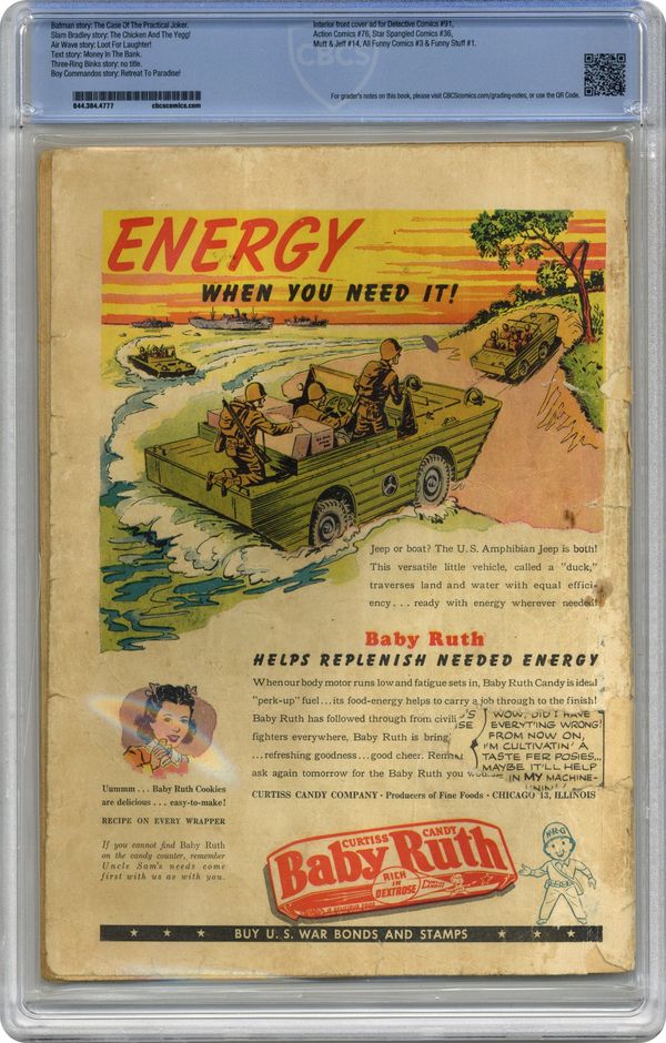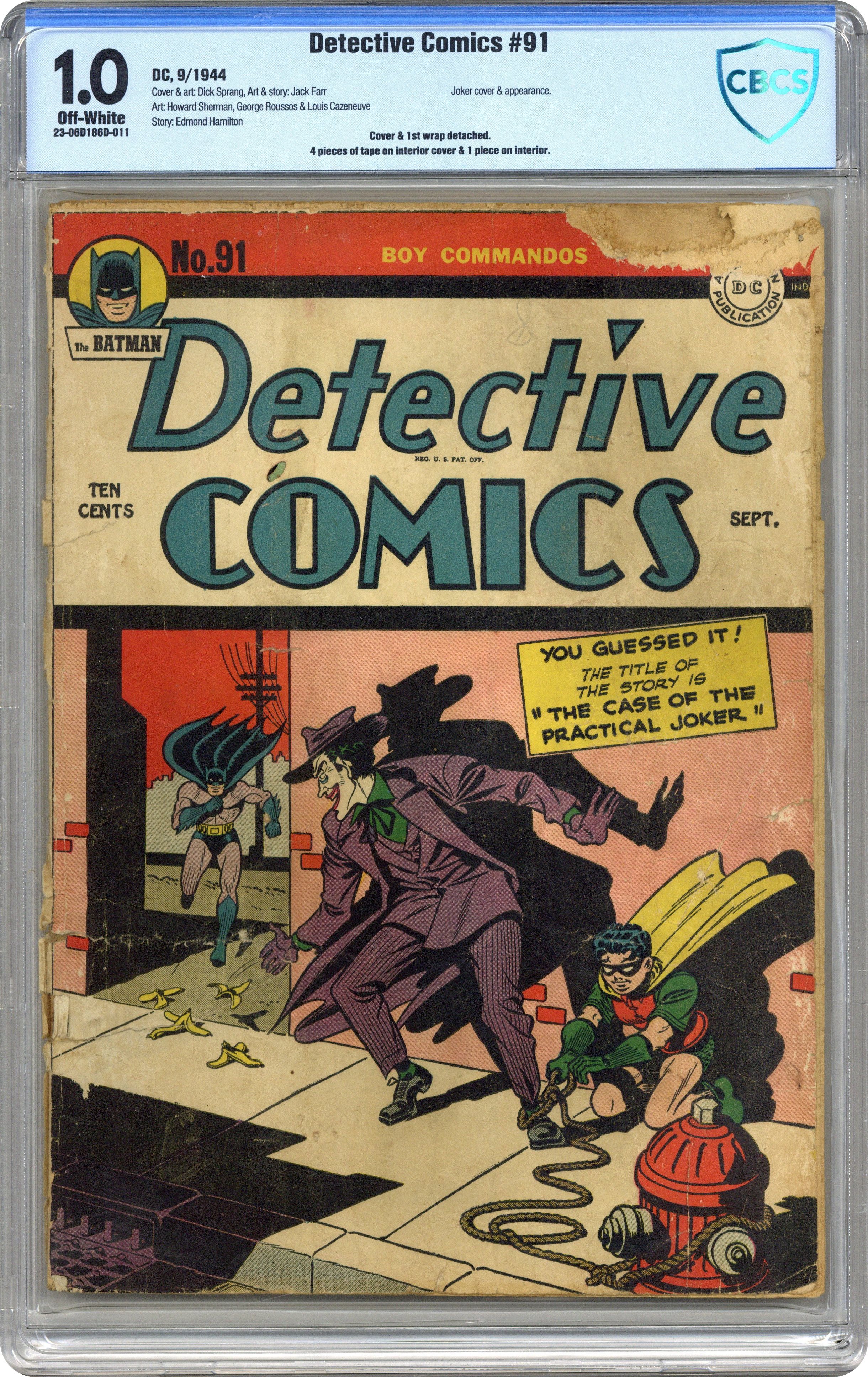 Ended Feb 4 2024 Winning Bid $425 Cover by Dick Sprang. Stories by Edmond Hamilton, Jack Farr and unknown. Art by Dick Sprang, Jack Farr, Howard Sherman, George Roussos and Louis Cazeneuve. While in prison, the Joker becomes the butt of practical jokes played against him, so he threatens to escape and steal an entire city in retaliation in the Batman and Robin tale "The Case of the Practical Joker" by Edmond Hamilton and Dick Sprang. Plus: Three-Ring Binks in an untitled story by Jack Farr; Slam Bradley in "The Chicken and the Yegg!" with art by Howard Sherman; Air Wave in "Loot for Laughter!" with art by George Roussos; and The Boy Commandos in "Retreat to Paradise!" with art by Louis Cazeneuve (not by Simon and Kirby, despite the listed credits). Also: Casey the Cop 1-pager by Henry Boltinoff; Jerry the Jitterbug 1-pager by Boltinoff; and 2-page text story "Money in the Bank" by Stan Carter. 52 pages, full color. Cover price $0.10. Grade: CBCS 1.0 explanation of grade Condition: Used (collectible)
