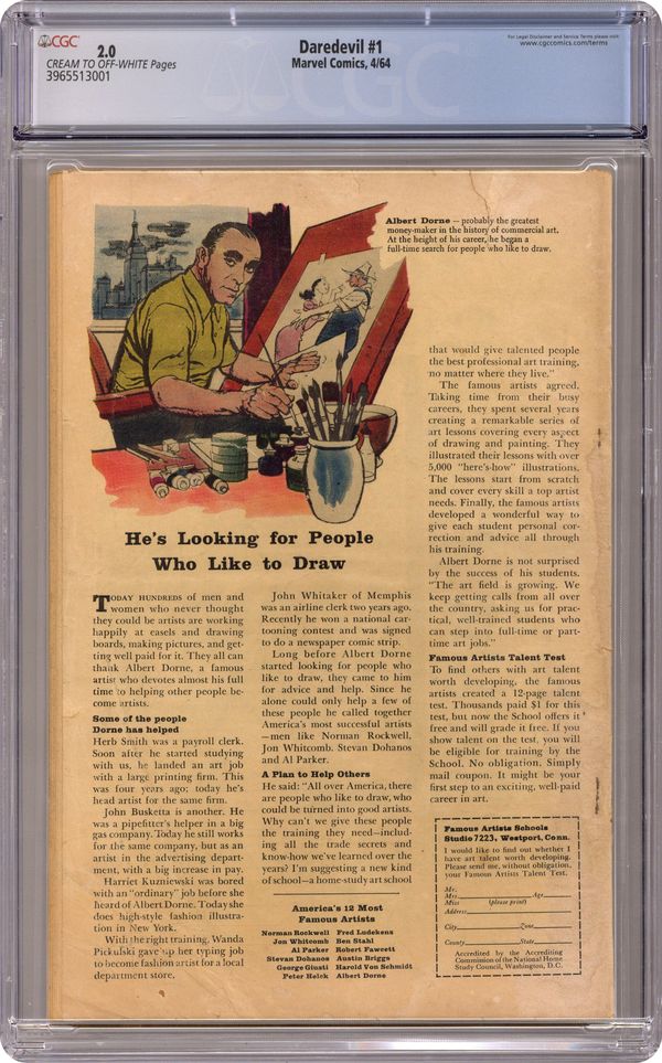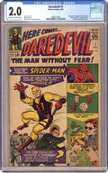 Cover pencils by Jack Kirby, inks by Bill Everett. First appearances of Daredevil, Karen Page, and Foggy Nelson in The Origin of Daredevil, script by Stan Lee, art by Bill Everett (splash page penciled by Jack Kirby); Matt Murdock saves a blind man from an oncoming truck but is struck blind himself by a radioactive canister during the rescue; The radioactivity heightens Matt's other senses and gives him an uncanny radar sense; Matt graduates college and begins practicing law with his college roommate Foggy; Matt's father, a boxer, is killed by the Fixer after he refuses to throw a fight; Matt designs a costume and a billy club (from his cane) and takes his derogatory childhood nickname "Daredevil"; DD tracks down the Fixer and the man who shot his father. Spider-Man and Fantastic Four appear on the cover but not in the story inside. 36 pgs. Cover price $0.12. Cover price $0.12. Grade: CGC 2.0 explanation of grade Condition: Used (collectible)
