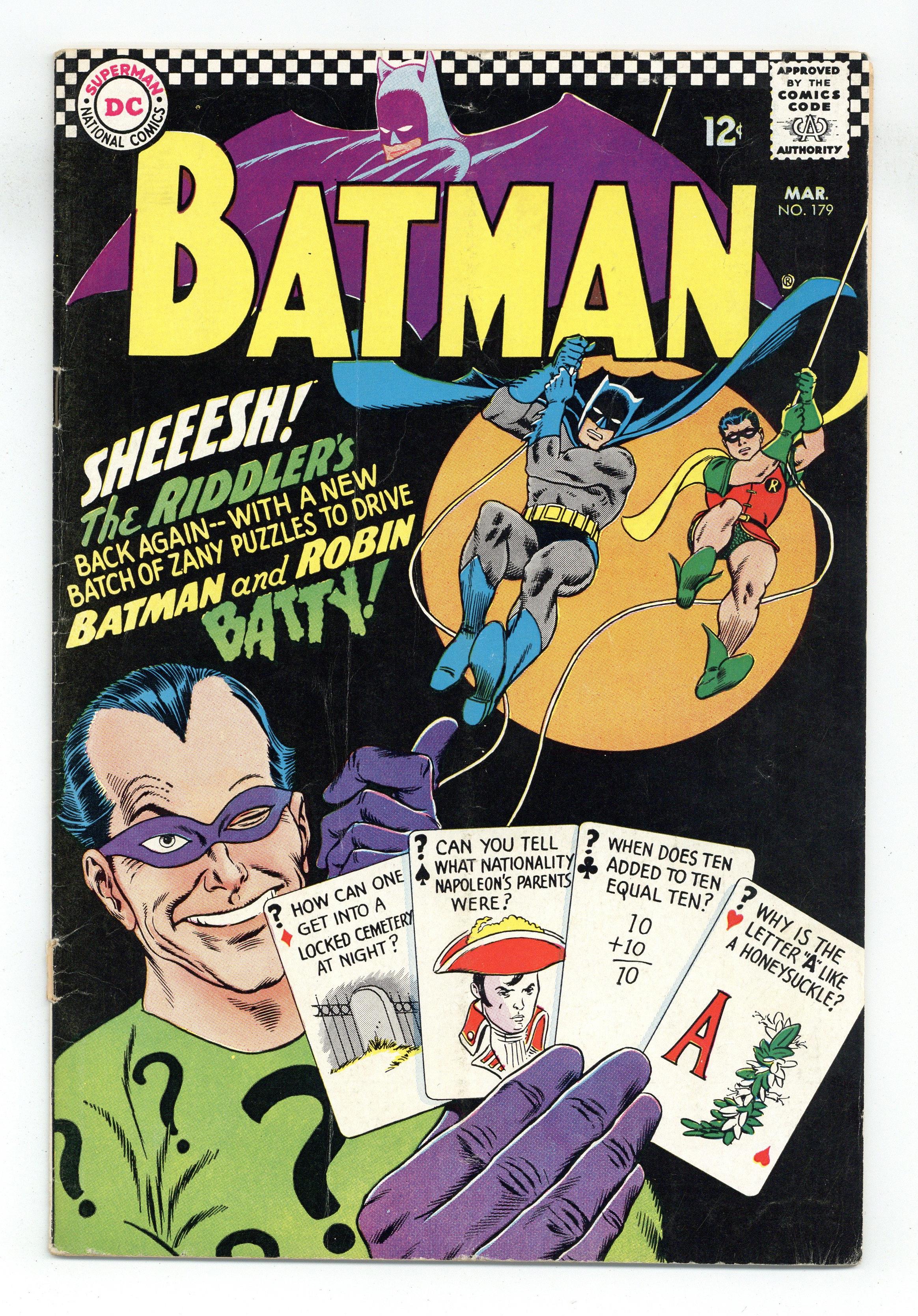 Cover pencils by Gil Kane, inks by Murphy Anderson. Do You Make Life Hard for Yourself? public service announcement, art by Bernard Baily; Betsy tells young Bobby that he should keep his room neater but realizes that she has the same problem. "Clay Pigeon for a Killer!", script by Robert Kanigher, pencils by Sheldon Moldoff (as Bob Kane), inks by Sid Greene; An actor announces on TV that he has solved a murder case and will announce who the killer is the next day; When the actor confesses to Bruce Wayne that this was an act to lure the real killer out into the open, the Caped Crusader poses as the actor to protect the man's life. One-page Casey the Cop story by Henry Boltinoff. The 2nd Silver Age appearance of the Riddler in "The Riddle-Less Robberies of the Riddler!", script by Gardner Fox, pencils by Sheldon Moldoff (as Bob Kane), inks by Joe Giella; After the Riddler breaks out of prison, he vows never again to send riddles to Batman again before he strikes; The Caped Crusader smells a rat and discovers subtle clues that lead to the Riddler's downfall. Cap's Hobby Hints activity half-page by Henry Boltinoff. Letter to the editor from Guy H. Lillian III. 36 Pages, Full Color. Cover price $0.12. Grade: GD 2.0 explanation of grade Condition: Used (collectible)