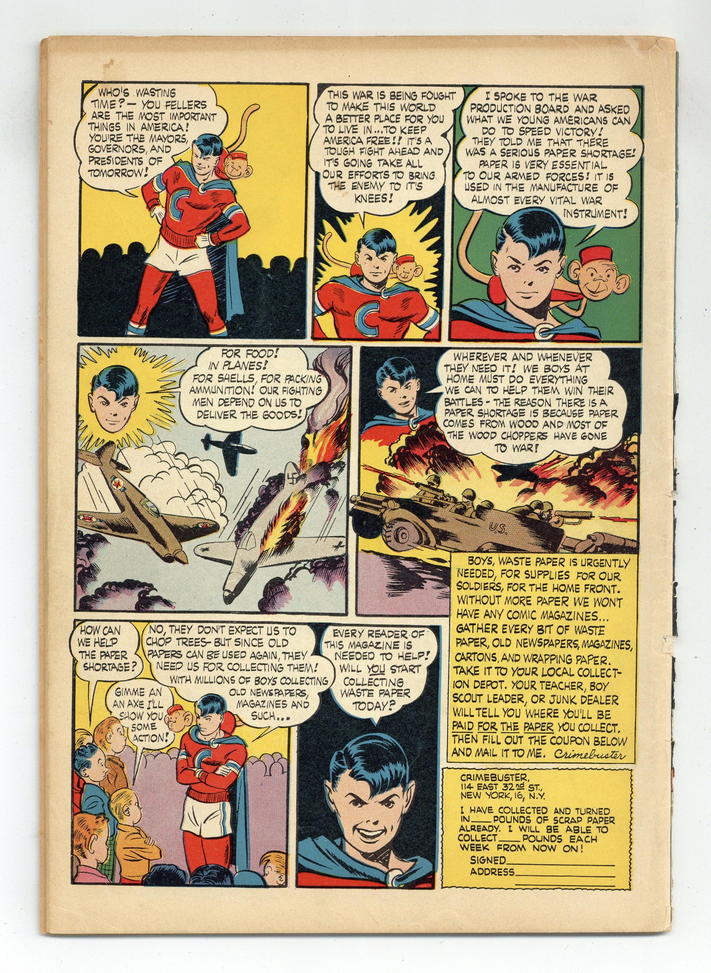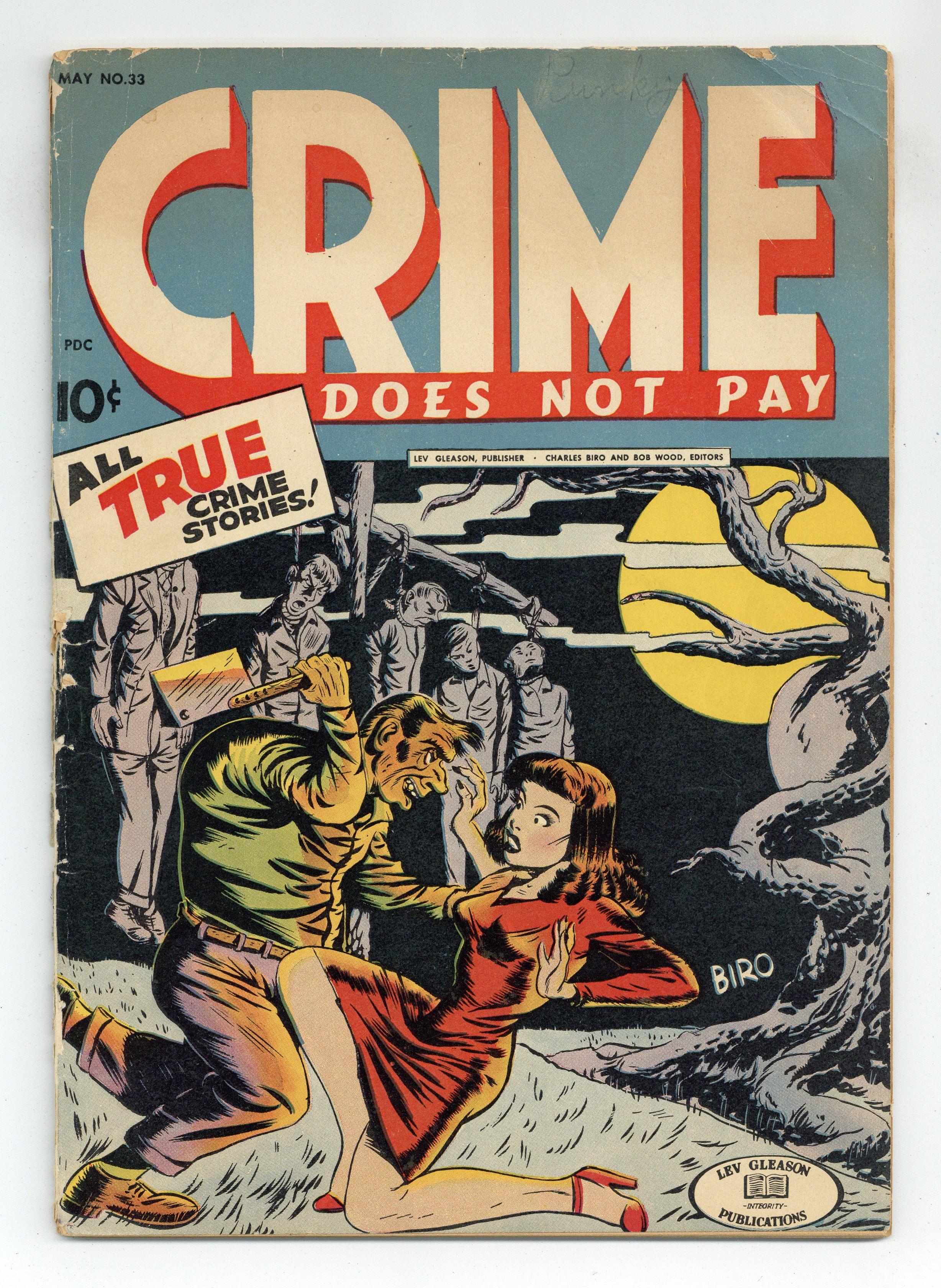 Cover by Charles Biro. Stories and art by Rudy Palais, Dick Wood, Dick Briefer, Bob Wood, and Charles Biro. The title that launched the crime comics genre, Crime Does Not Pay was noted for its violent pre-Code content and lurid tales of underworld life. A woman is dubbed a "female Bluebeard" after doing away with her husbands, in a story with art by Dick Briefer. The story of Nolan the Notorious features early art by pioneering African-American artist Alvin Hollingsworth. The murderer of Mary Lawson is revealed by a burnt match, in a tale with art by Dick Briefer. Also featuring a vintage PSA for wartime paper drives, an early recycling program. Career of Carrington Hill; Four Crooks and a Coffin; Female Blue Beard; Murder Master; Angel Face of Crime; The Case of the Missing Monster; Nolan the Notorious; Whodunnit? Who Murdered Beautiful Mary Lawson?; A Crimebuster Special. 52 pages, Full Color. Cover price $0.10. Grade: GD+ 2.5 explanation of grade Condition: Used (collectible)