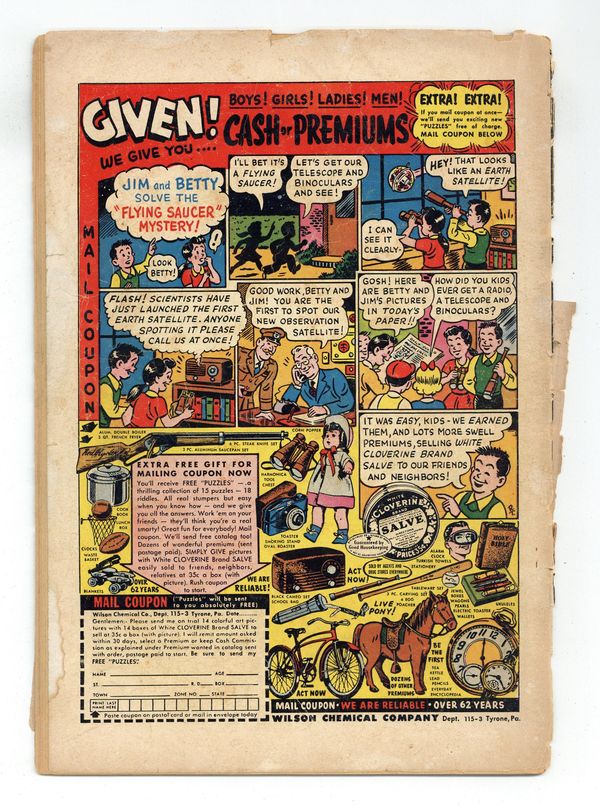 Cover pencils by Carmine Infantino, inks by Frank Giacoia. 2nd appearance of the Flash in "The Secret of the Empty Box!", script by Robert Kanigher, pencils by Carmine Infantino, inks by Frank Giacoia; Under cover of fog, a giant mystery box appears in Central City; While the police have their attention on opening the box, a trio of burglars commits robberies around town. Origin and 1st appearance of Capt. Cold in "The Coldest Man on Earth!", script by John Broome, pencils by Carmine Infantino, inks by Frank Giacoia; Flash faces off against Captain Cold, who commits crimes by using a cold-gun to freeze things and create mirages; But once Flash figures out what Captain cold can do, he ignores the mirages and takes the villain in. "The Race of Wheel and Keel," script by Gardner Fox, pencils by Gil Kane, inks by Harry Lazarus; A race between a stagecoach and a clipper ship; The stagecoach leaves from Saint Louis for California and the clipper leaves from New York for California. 36 Pages, Full Color. Cover price $0.10. Grade: PR 0.5 explanation of grade Condition: Used (collectible)