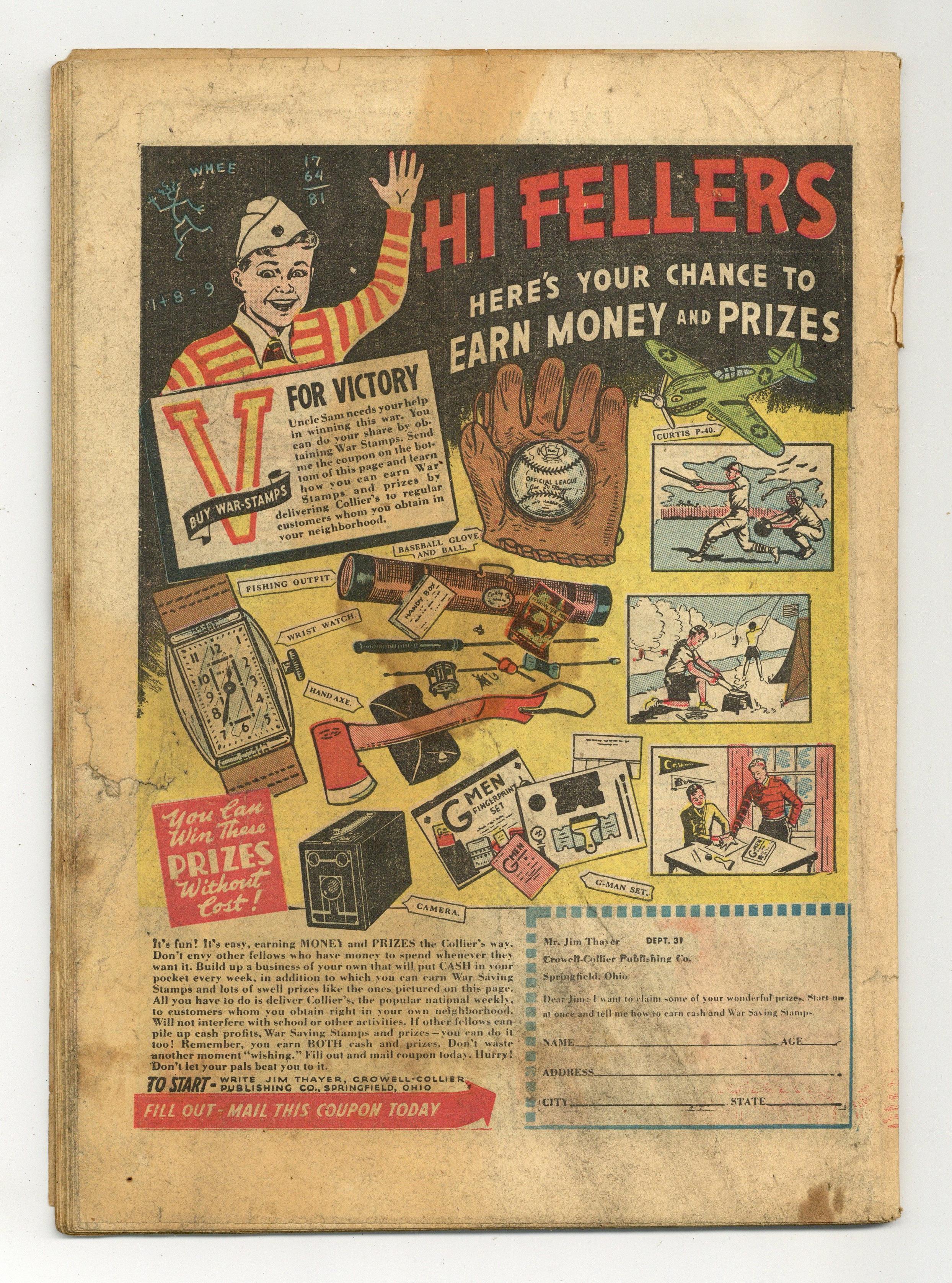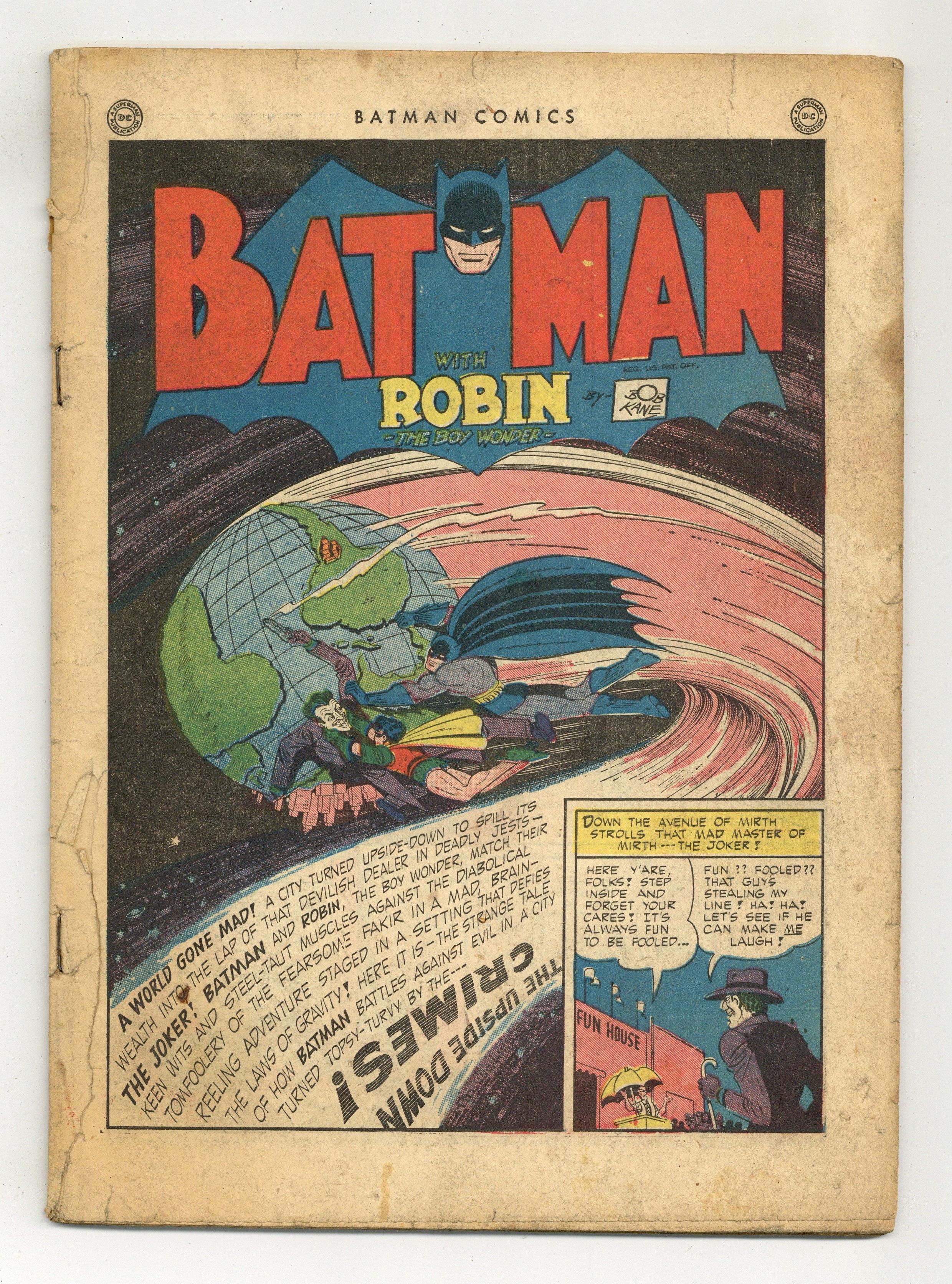 Cover by Dick Sprang. "The Upside Down Crimes!", script by Bill Finger, pencils by Dick Sprang (as Bob Kane), inks by Gene McDonald; Batman and Robin must stop the Joker's mad schemes, as he commits several "upside down crimes" that leave the Caped Crusaders literally standing on their heads. 1-page Life's Little Laffs story by Ray Houlihan. "Damsel in Distress!", script by Don Cameron, art by Dick Sprang (as Bob Kane); Dick's crush on a girl leads him and the Batman into a case involving kidnapping and murder. 1-page Handy Andy story by Jack Farr. "Borrowed Butler!", art by Jerry Robinson (as Bob Kane); Bruce hires out Alfred to a neighbor who is having week-end guests, and whose butler is sick. "Accidents Will Happen" text story by Tod Lowry. "Pelt Plunderers!", script by Bill Finger, art by Dick Sprang (as Bob Kane); Batman and Robin head up into the frozen north to assist the Royal Canadian Mounted Police stop a gang of thieves who plunder beaver pelts trapped by locals and who then sell them for big profits, which they plan to spend back in the States. 52 Pages, Full Color. Cover price $0.10. Grade: Coverless explanation of grade Condition: Used (collectible)
