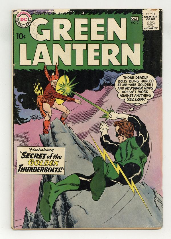 Cover pencils by Gil Kane, inks by Murphy Anderson. The Secret of the Golden Thunderbolts!, script by John Broome pencils by Gil Kane, inks by Joe Giella; Green Lantern learns of the anti-matter universe of Qward. He travels there to rescue the few lawful citizens and brings them to Earth and closes the portal between dimensions. Riddle of the Frozen Ghost Town!, script by John Broome, pencils by Gil Kane, inks by Joe Giella; Tom Kalmakus' father and Jimmy Dawes had stumbled on a gold mine and split the map for keeping while Dawes raised money to work it, but Tom's father died and Dawes lost his map while gambling. Duke Danfield won the map half and steals Tom's half to find the gold, but Green Lantern defeats his gang and Tom discovers Hal's secret identity as Green Lantern; Introduction of Pieface [Thomas Kalmaku]. 36 pages, full color. Cover price $0.10. Grade: GD/VG 3.0 explanation of grade Condition: Used (collectible)