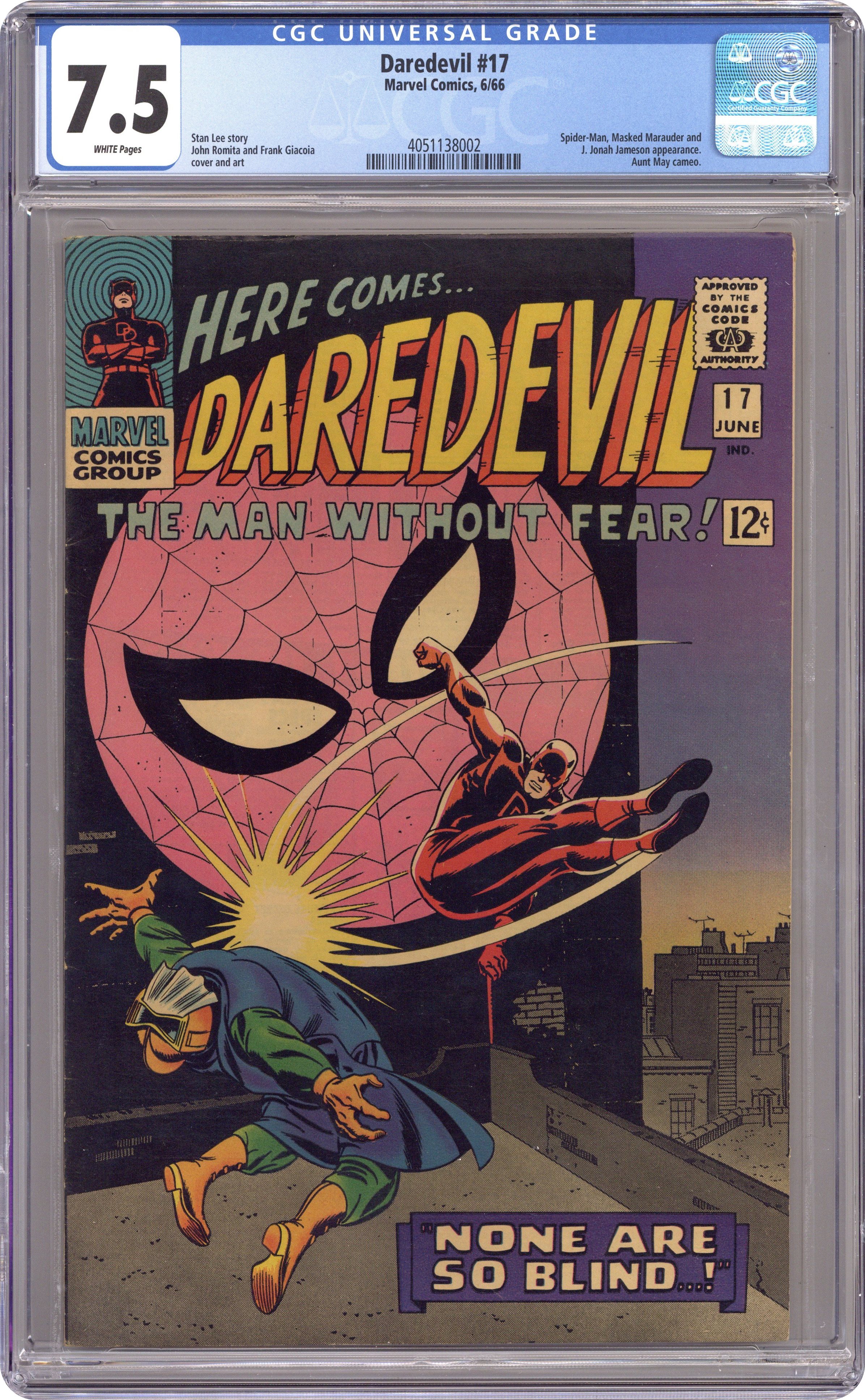 Ended Oct 31 2023 Winning Bid $111 Cover pencils by John Romita, inks by Frank Giacoia. Spider-Man guest stars in None Are So Blind!, script by Stan Lee, pencils by John Romita Sr., inks by Frank Giacoia (as "Frank Ray"); Spidey, thinking he has discovered Daredevil's secret, accuses Foggy of being DD; Foggy kind of plays along to impress Karen; DD and Spidey stop fighting long enough to take down the Masked Marauder. 36 pgs. Cover price $0.12. Cover price $0.12. Grade: CGC 7.5 explanation of grade Condition: Used (collectible)