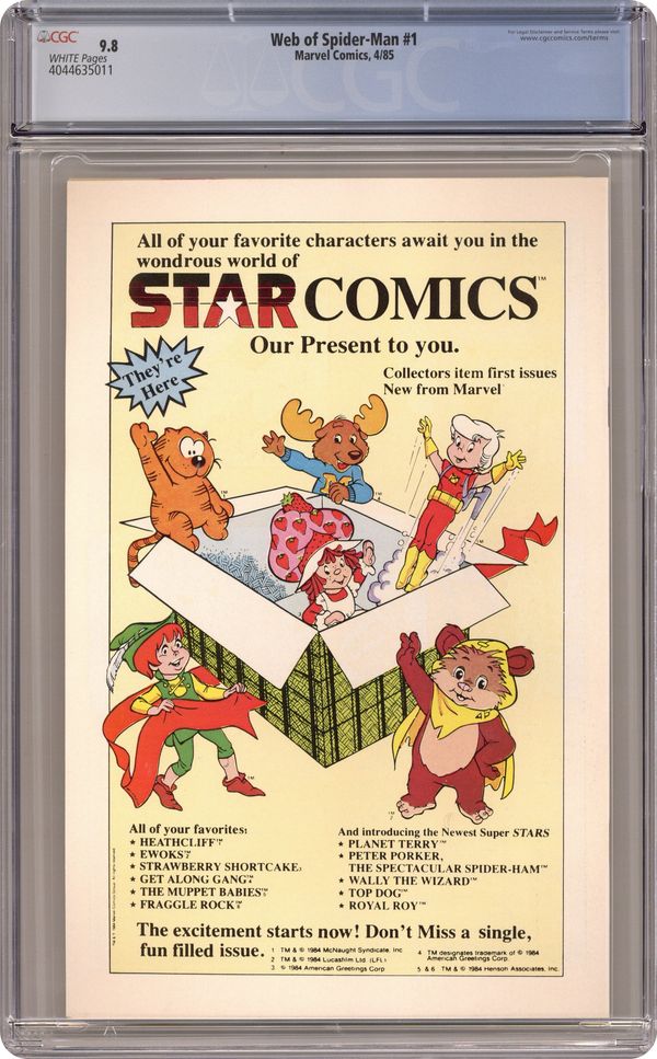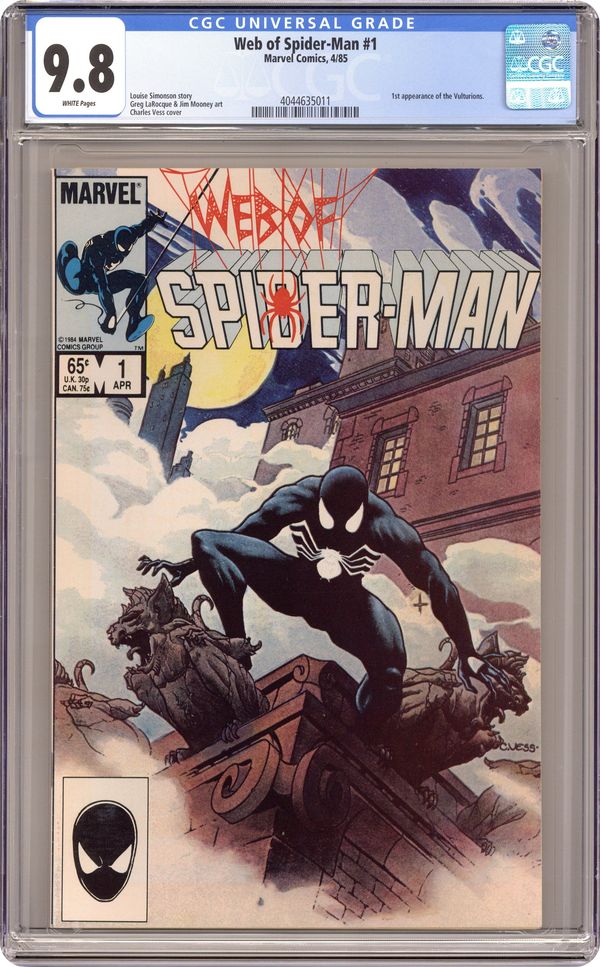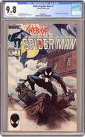 Direct Edition. "Til Death Do Us Part!" Story by Louise Simonson. Art by Greg LaRocque and Jim Mooney. Painted cover by Charles Vess. The alien symbiote (aka black costume) ambushes Peter Parker while he is getting dressed. Now Spider-Man must battle the black costume and the new Vulturions on his way to the Baxter Building! Meanwhile, Aunt May laments Peter's decision to drop out of graduate school. (Note: The Web of Spiderman series essentially replaced the Marvel Team-Up title as Marvel's third regular series featuring Spider-Man.) 32 pages Cover price $0.65. Grade: CGC 9.8 explanation of grade Condition: Used (collectible)