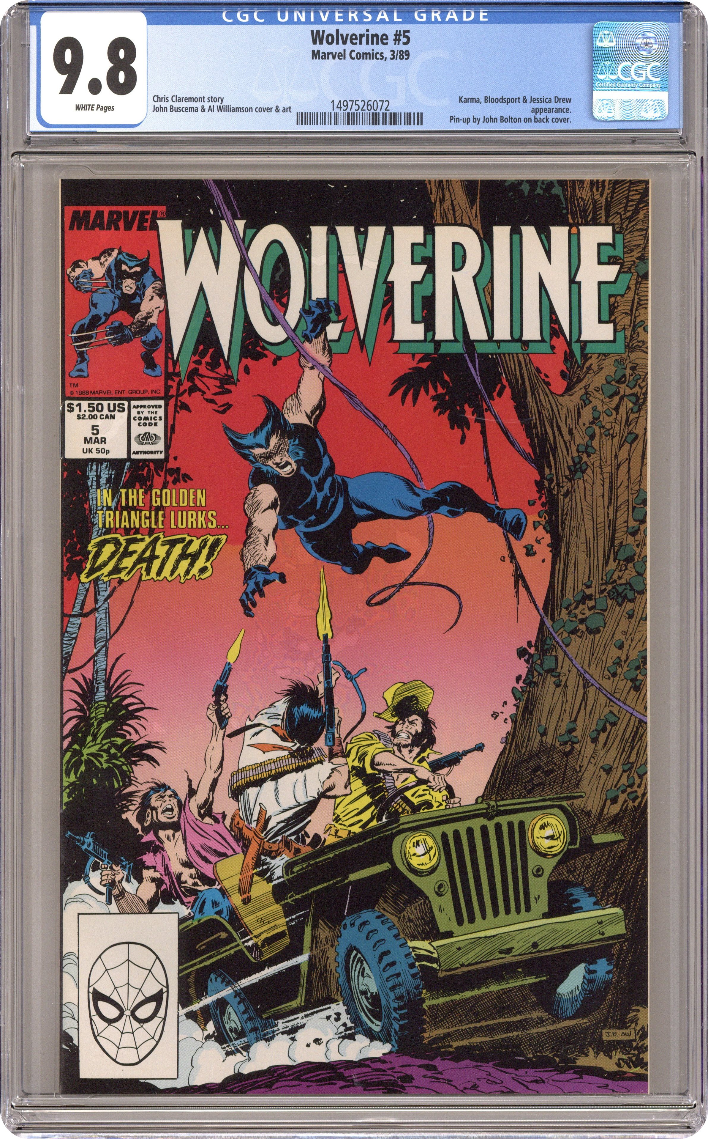 Direct Edition. "Hunter's Moon!" Written by Chris Claremont. Art by John Buscema and Al Williamson. With help from pilot Archie Corrigan, Wolverine takes out the Harriers in the Golden Triangle and puts the kibosh on General Coy's opium crop. John Bolton art on back cover. 32 pages, FC Cover price $1.50. Grade: CGC 9.8 explanation of grade Condition: Used (collectible)