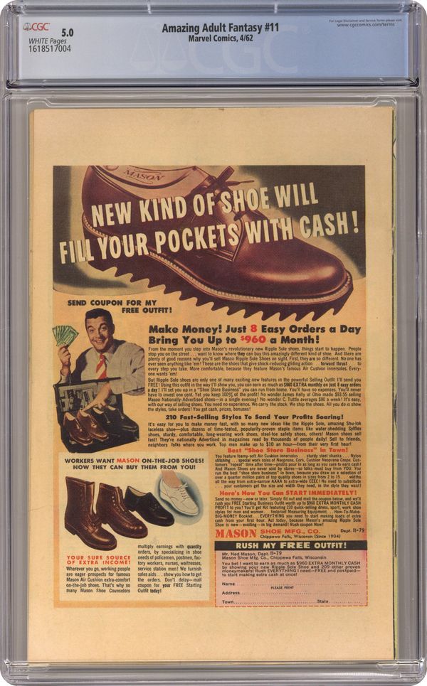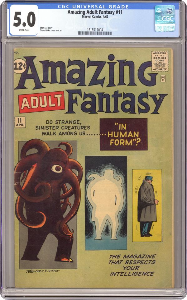 Cover art by Steve Ditko. In Human Form!; Alien invaders send a shapeshifting scout to disguise himself as one of Earth's dominant life form, but he mistakenly takes the form of a mosquito and is swatted. For the Rest of Your Life!; Jupiter's courts are thought soft, but their convicts are actually imprisoned for life within an illusion of freedom. The Secret of the Universe!; A rocket is built which travels faster than light in order to probe the edge of the visible universe, but the volunteer pilot de-ages to infancy during the trip, curing him of his terminal disease. The Ice Monster Cometh! Where Walks the Ghost? All scripts by Stan Lee, all art by Steve Ditko. 36 pgs. $0.10. Cover price $0.12. Grade: CGC 5.0 explanation of grade Condition: Used (collectible)