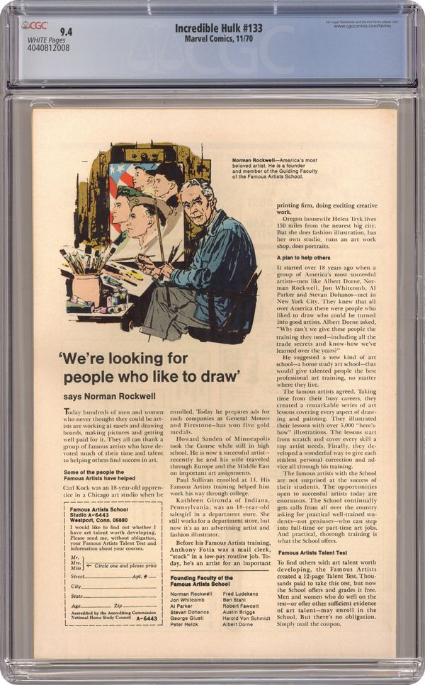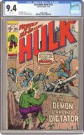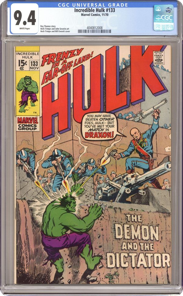 Cover pencils by Herb Trimpe, inks by Bill Everett. Day of Thunder--Night of Death!, script by Roy Thomas, pencils by Herb Trimpe, inks by John Severin; Hulk tries to help a dying Jim but turns the boy over to Ross in the hopes that his friend can be saved; Hulk mails himself to the country of Morvania where he comes into conflict with the brutal dictator Draxon. 36 pgs. $0.15. Cover price $0.15. Grade: CGC 9.4 explanation of grade Condition: Used (collectible)
