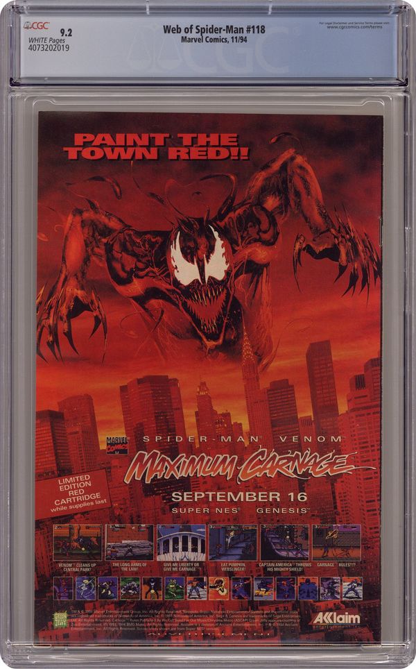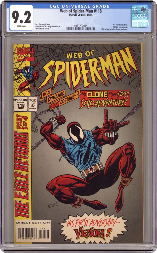 First Printing. Direct Edition. "Exiles Return Part 1 of 4: Memories" Written by Terry Kavanagh. Pencils by Steve Butle. Inks by Randy Emberlin. Venom and Clone appear. Note: First appearance of Ben Reilly as the Scarlet Spider. Cover price $1.50. Grade: CGC 9.2 explanation of grade Condition: Used (collectible)