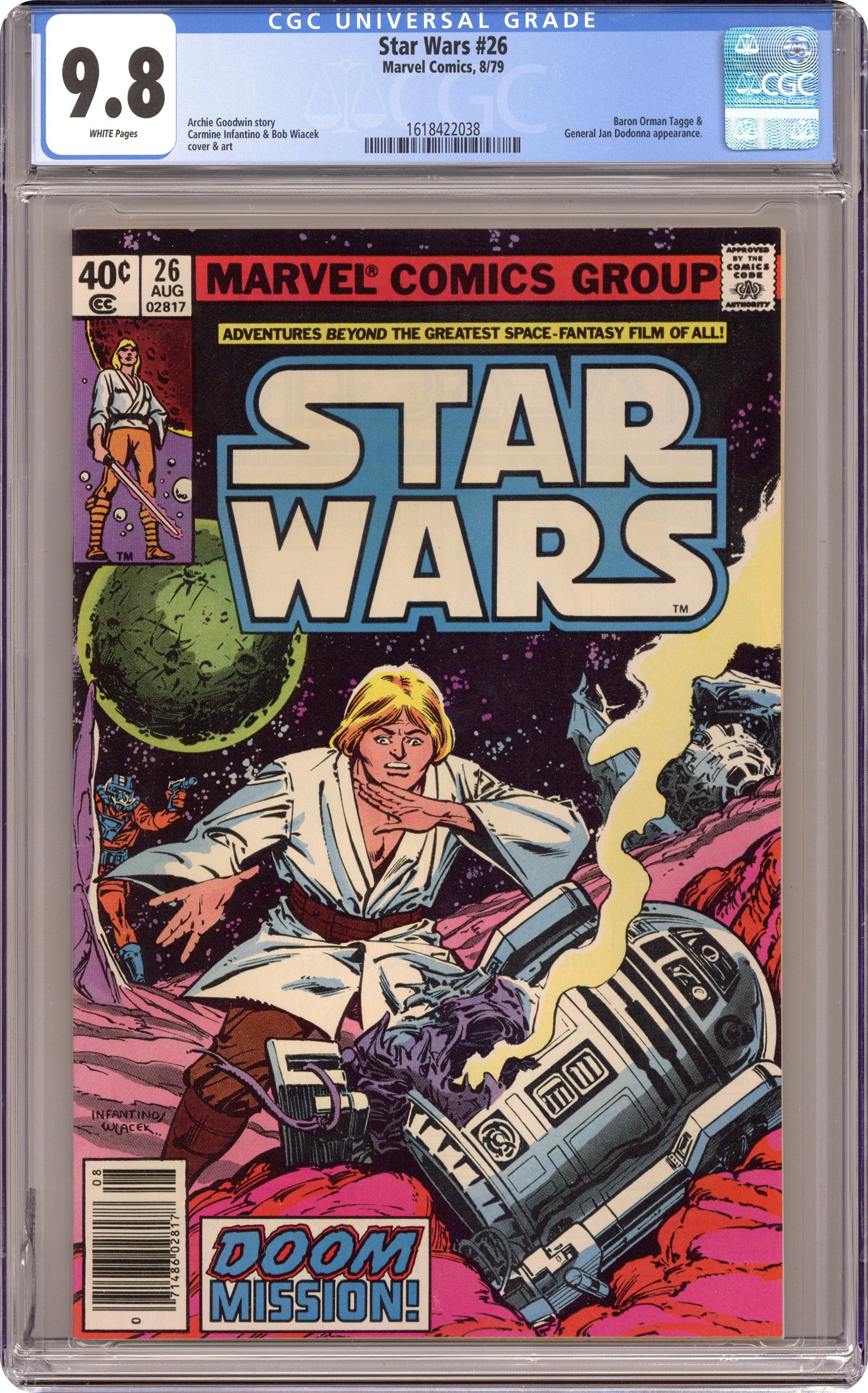 Direct Edition. "Doom Mission!" Written by Archie Goodwin. Art by Carmine Infantino and Bob Wiacek. When R2-D2 is gunned down, Luke contemplates his recent failures. Then the young hero sets out on another harrowing mission while piloting a captured enemy Tie-Fighter. Cover price $0.40. Grade: CGC 9.8 explanation of grade Condition: Used (collectible)