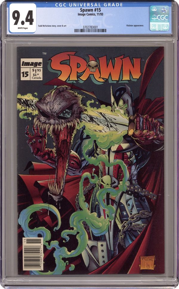 Newsstand Edition. "Myths!" Part 2 of 2. Story and art by Todd McFarlane. The demonic little clown known as the Violator continues his skewed version of the tale about his epic battle with the Medieval Spawn from issue #9. Includes 2 pin-ups of Spawn. Cover price $1.95. Grade: CGC 9.4 explanation of grade Condition: Used (collectible)