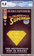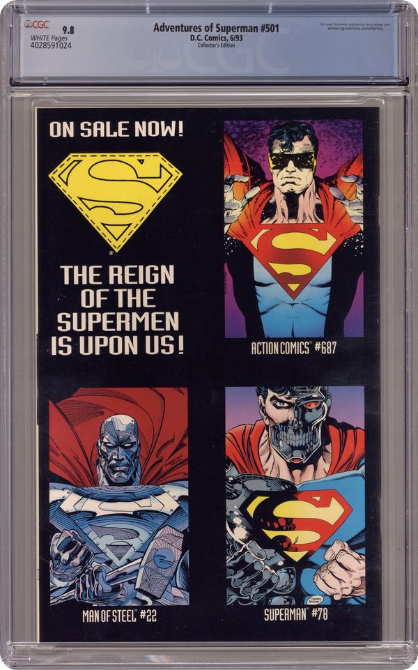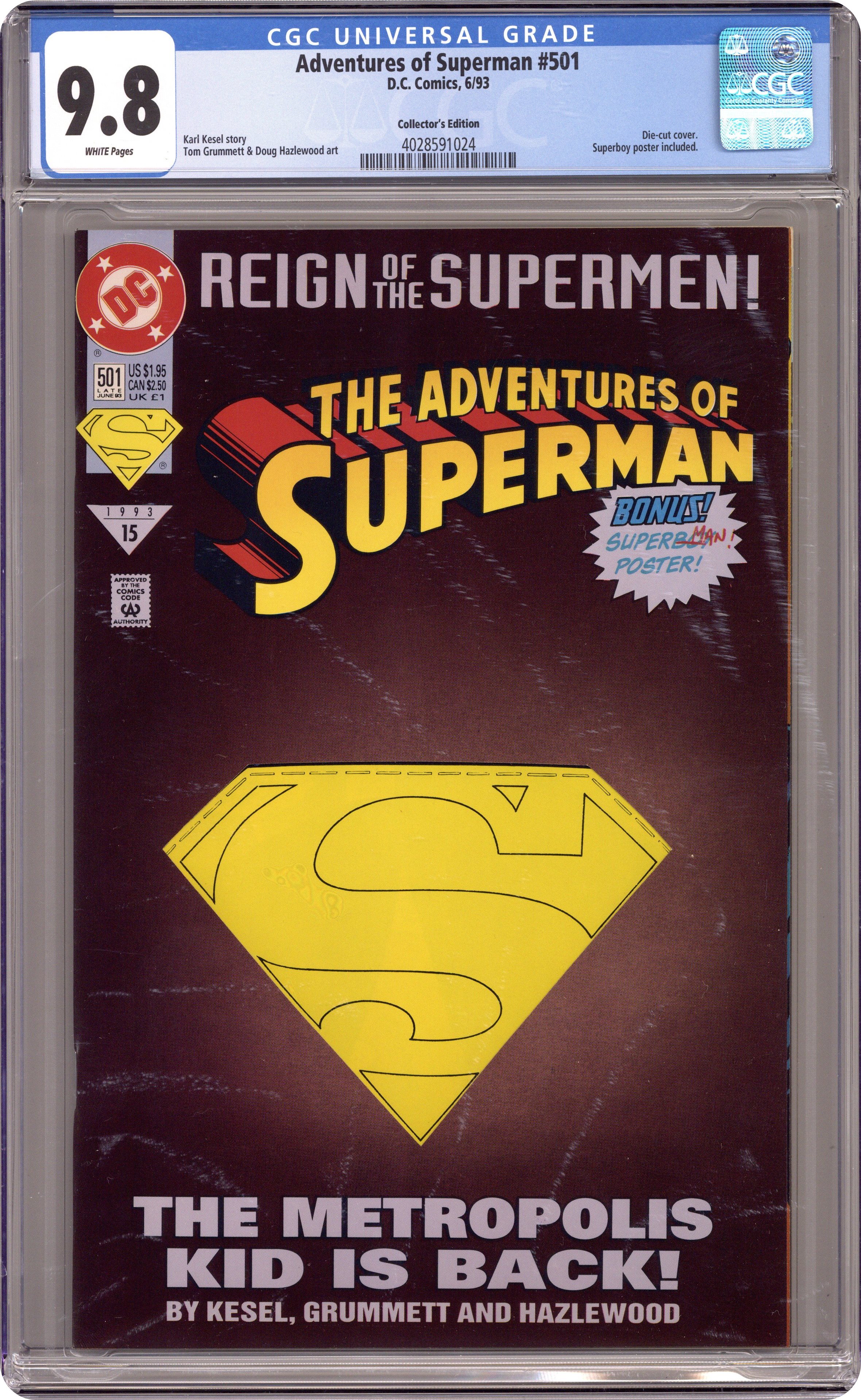Collector's Edition with Die-Cut Cover. Reign of the Supermen! There's a youngster in town claiming to be Superman in "The Adventures of Superman...When He Was a Boy!" Guardian cameo. Written by Karl Kesel. Art & cover by Tom Grummett & Doug Hazlewood. Centerfold poster by Grummett & Hazlewood. Cover price $1.95. Grade: CGC 9.8 explanation of grade Condition: Used (collectible)