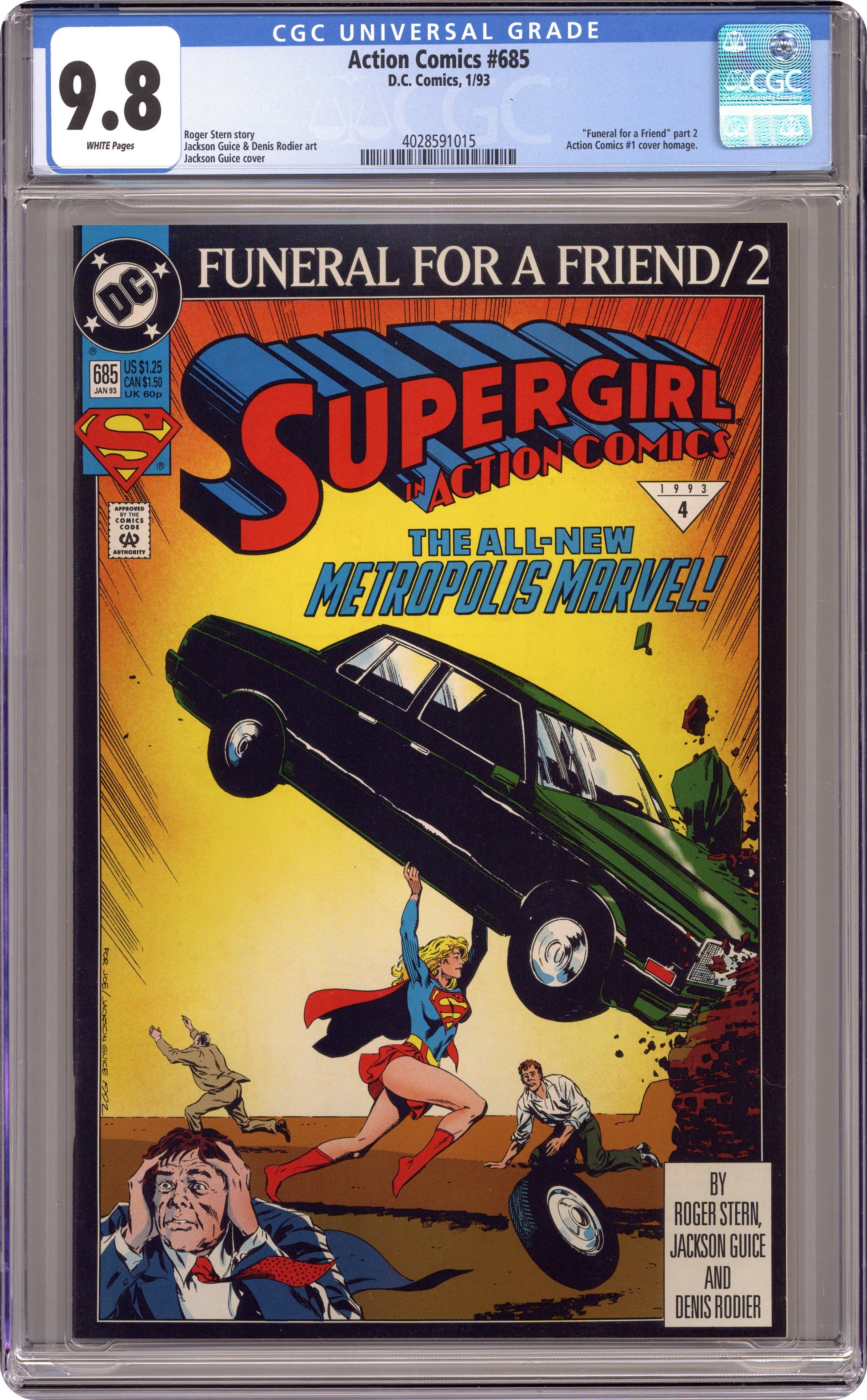 Direct Edition. Part 2 of the 8-part 'Funeral for a Friend,' continued from Adventures of Superman (1939) #498. Clark Kent is discovered missing in the wake of Superman's tragic battle with Doomsday while, in the Man of Steel's absence, Supergirl moves to take up his position as guardian of Metropolis. Continued in Superman The Man of Steel (1991) #20. Written by Roger Stern, with art by Jackson Guice and Denis Rodier. Cover by Guice. 36 pages, Full Color, $1.25. Cover price $1.25. Grade: CGC 9.8 explanation of grade Condition: Used (collectible)