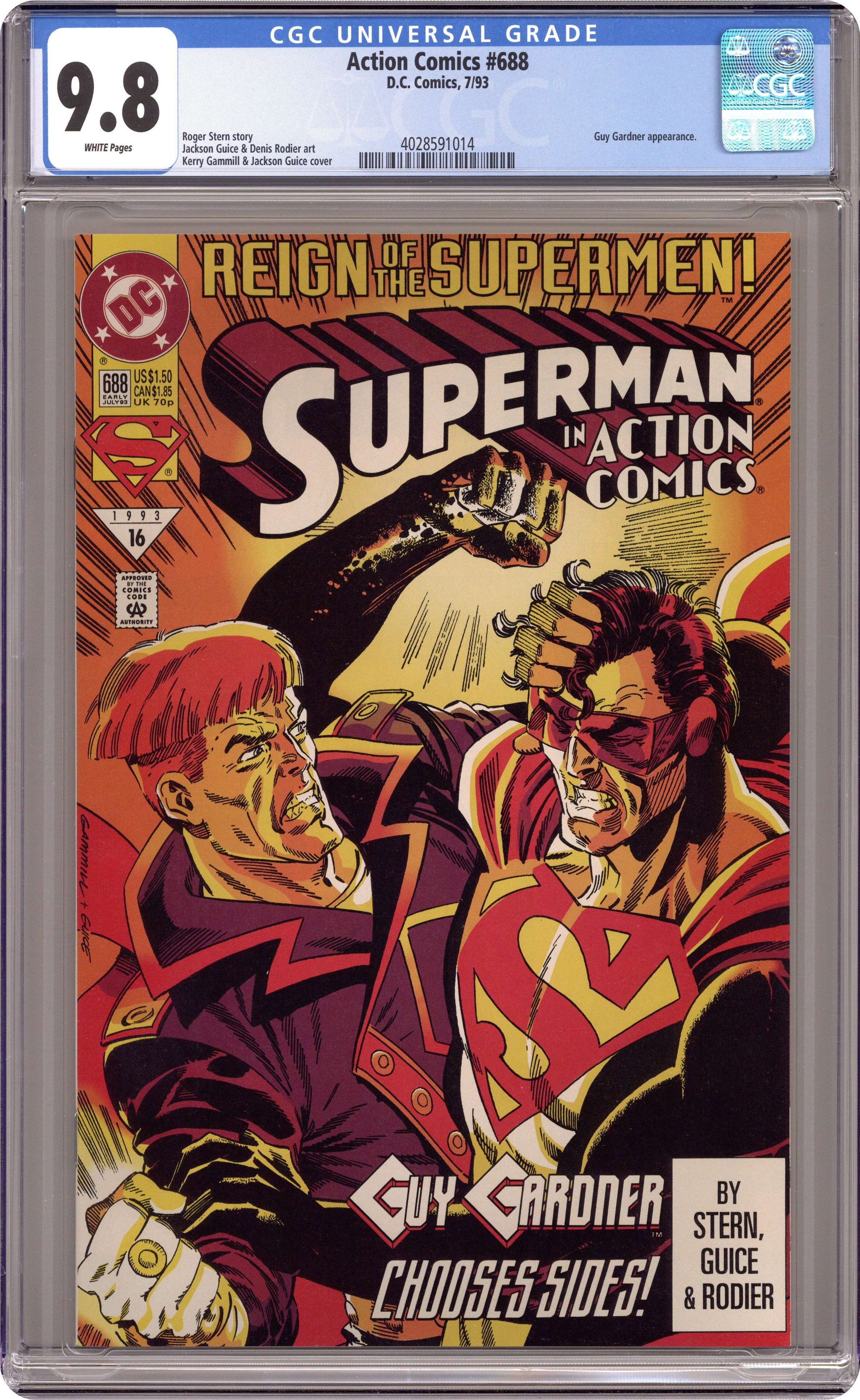 Reign of The Supermen! "An Eye for an Eye" by Roger Stern (script) & Jackson Guice/Denis Rodier (art); Kerry Gammill cover; Guy Gardner, Eradicator (as Superman), Lois Lane, Cat Grant app; Cameos by Blue Beetle, Superman, Ice, Doomsday, Superboy. 36 pages, Full Color, $1.50. Cover price $1.50. Grade: CGC 9.8 explanation of grade Condition: Used (collectible)