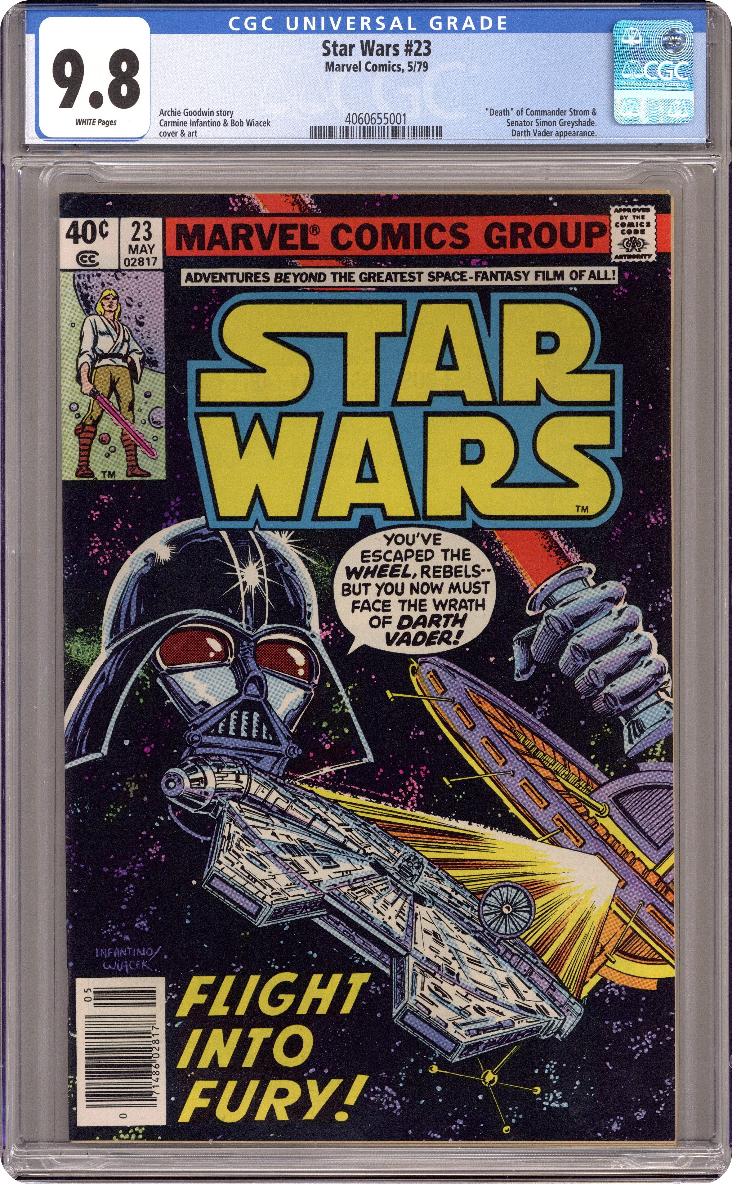 "Flight into Fury!" Written by Archie Goodwin. Art by Carmine Infantino and Bob Wiacek. Have Luke, Leia, and the rest survived their arduous ordeals at the Wheel only to fall into the clutches of Darth Vader himself? Cover price $0.40. Grade: CGC 9.8 explanation of grade Condition: Used (collectible)