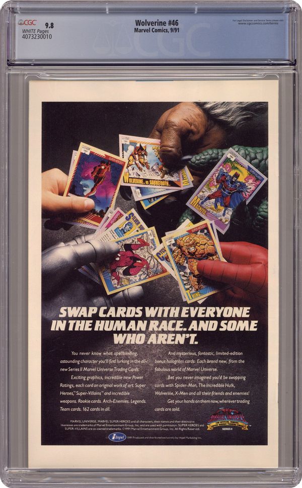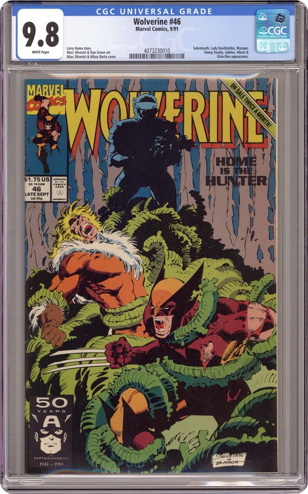 Direct Edition. Part 2 of 2 - "Home is the Hunter...!" Written by Larry Hama. Art by Marc Silvestri and Dan Green. Cover by Marc Silvestri and Hilary Barta. It's a four-way free for all as Wolverine, Sabretooth, Lady Deathstrike, and the Hunter in the Darkness tear into each other through the streets of New York. But who is the mysterious gunman taking potshots at them? 32 pages, FC Cover price $1.75. Grade: CGC 9.8 explanation of grade Condition: Used (collectible)