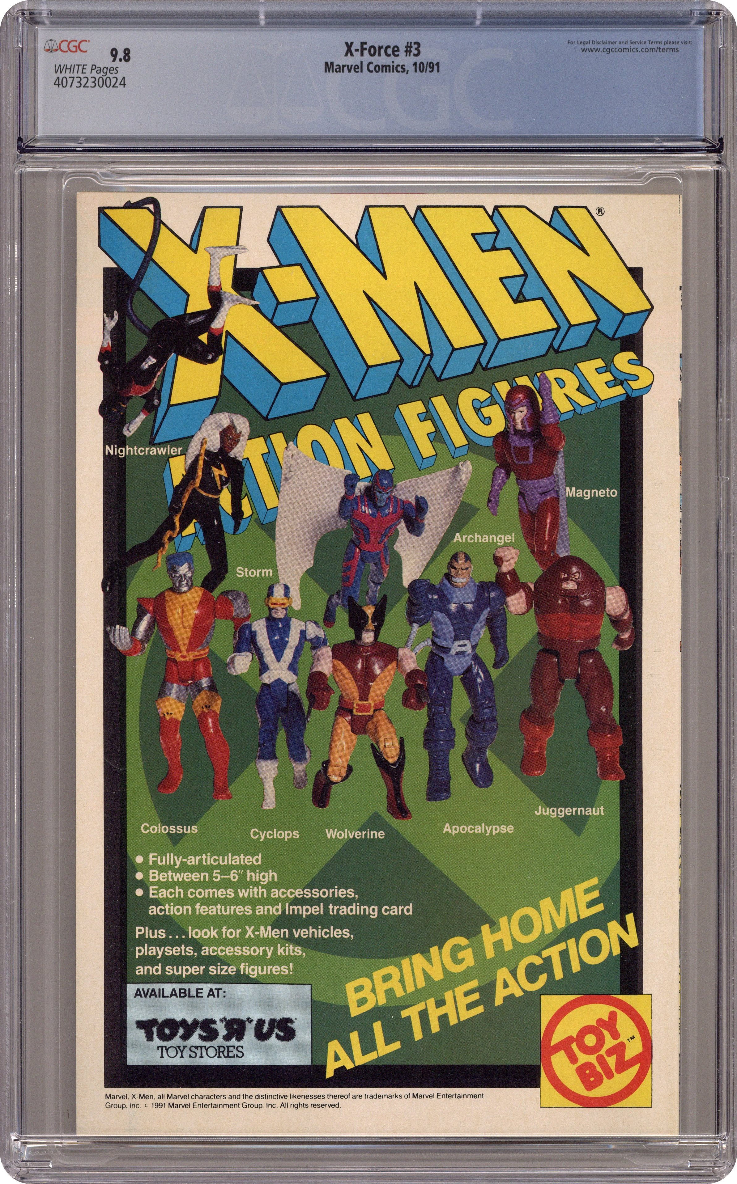 Cover art by Rob Liefeld. Battlecry, script by Rob Liefeld (Plot) and Fabian Nicieza, art by Rob Liefeld; Juggernaut and Black Tom are holding the World Trade Center hostage and Spidey teams up with X-Force to try and take them down; The last panel shows one of the Twin Towers being blown up. 36 pgs. $1.00. Cover price $1.00. Grade: CGC 9.8 explanation of grade Condition: Used (collectible)