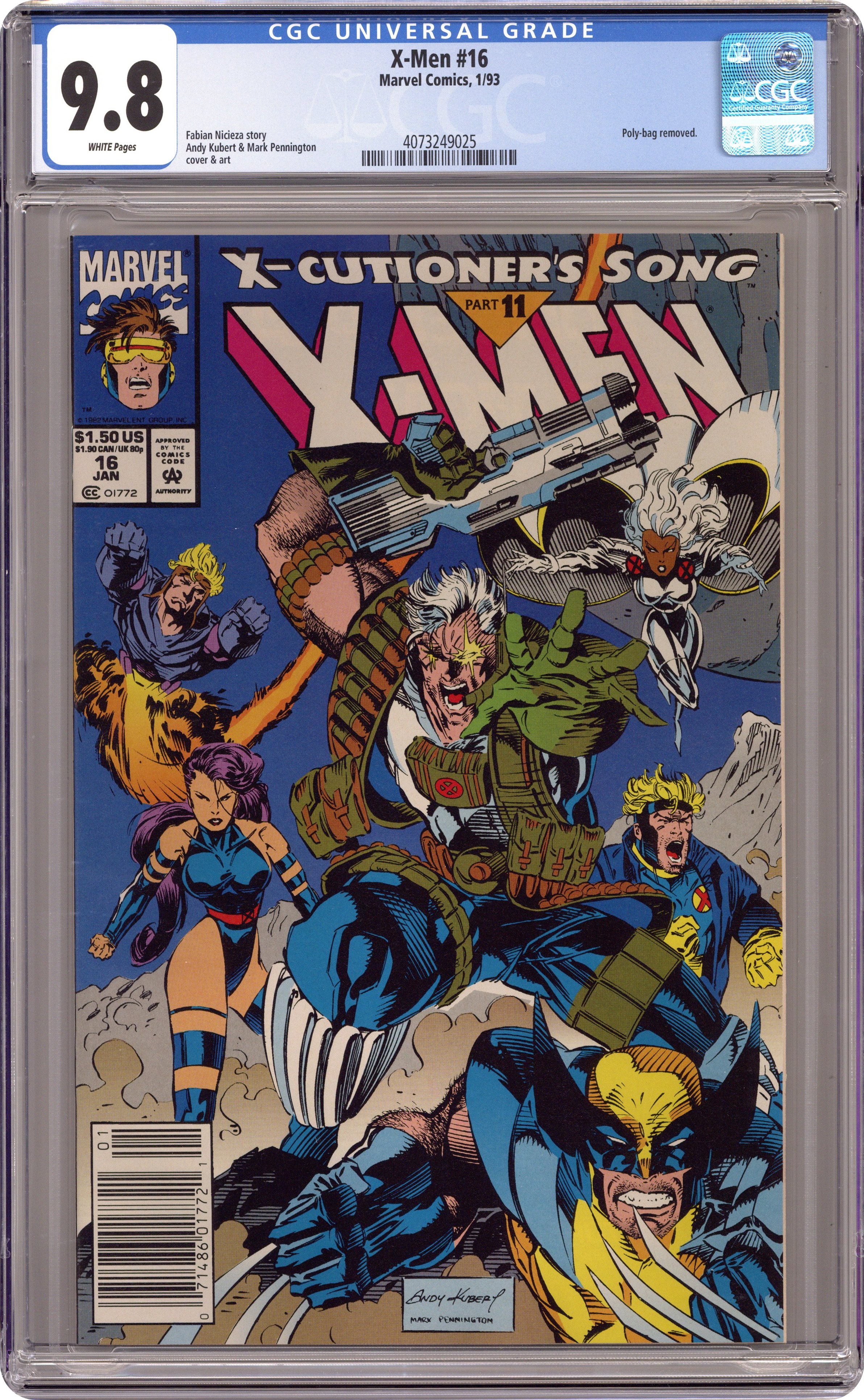 Unbagged copy without trading card. X-cutioner's Song part 11. Cover pencils by Andy Kubert, inks by Mark Pennington. Conflicting Catheoes, script by Fabian Nicieza, pencils by Andy Kubert, inks by Mark Pennington and Andy Kubert (pgs. 20-23); It is a battle royale through Stryfe's moon base to try and reach him before he kills Scott and Jean; Cont. from X-Factor #86; Cont. in X-Force #18. 36 pgs. $1.25. Cover price $1.50. Grade: CGC 9.8 explanation of grade Condition: Used (collectible)