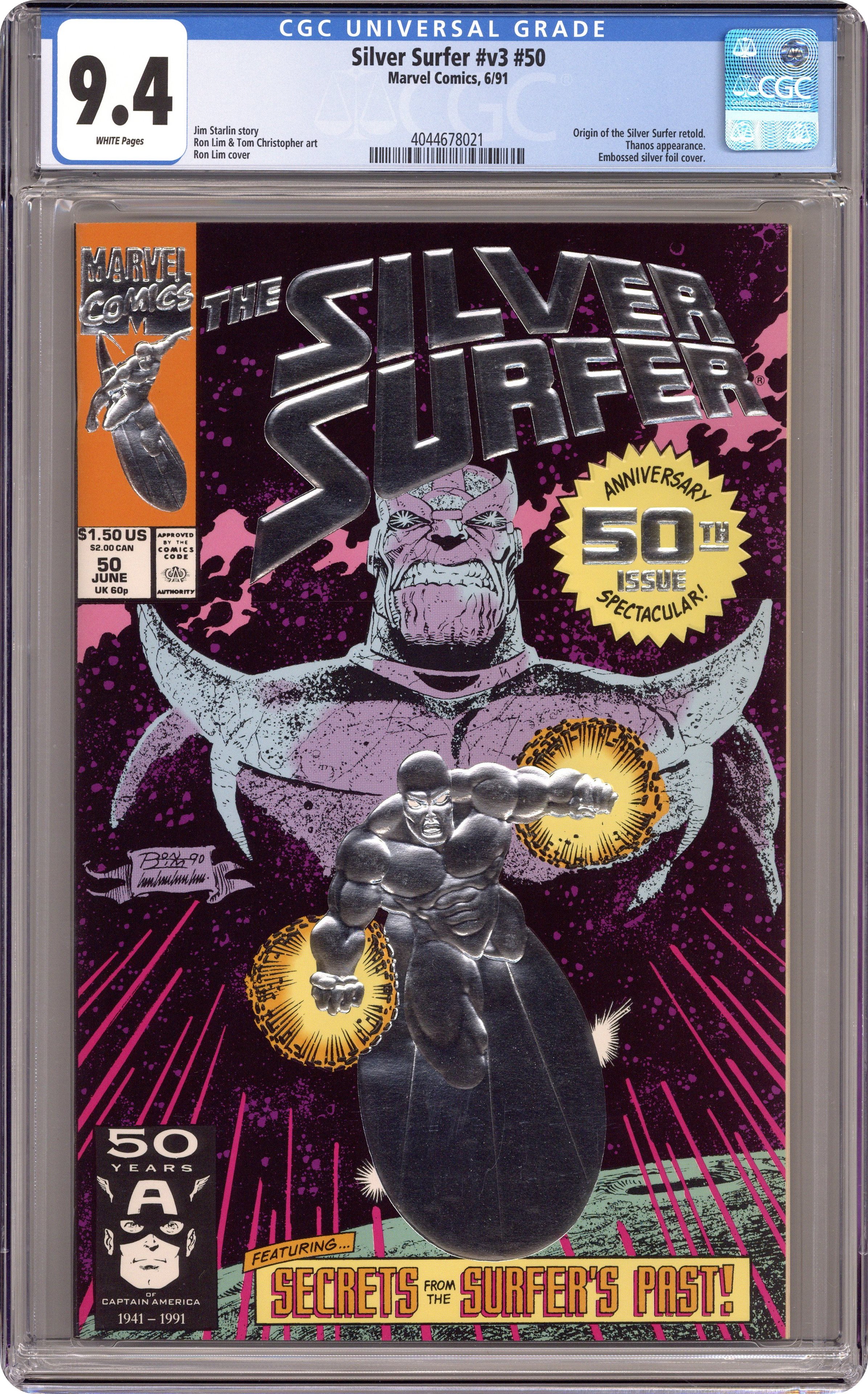 Direct Market Edition - 1st printing Infinity Gauntlet: Prelude - Special Anniversary Issue. "Deeply Buried Secrets!" Story by Jim Starlin. Art by Ron Lim and Tom Christopher. In this 50th issue celebration the Silver Surfer fights for his life against a stone golem with all the power and visage of his arch foe Thanos. Plus, learn a dark secret from Norrin Radd's past. By story's end the Surfer plummets toward planet Earth. Broken physically and mentally, will he be able to warn Earth's heroes of the threat Thanos poses to the universe? Story continues in Infinity Gauntlet #1. 48 pages. Cover price $1.50. Grade: CGC 9.4 explanation of grade Condition: Used (collectible)