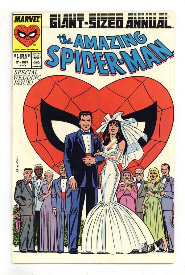 Ended Feb 27 2024 Winning Bid $22 Direct Edition. The marriage of Peter Parker and Mary Jane Watson in "The Wedding." Plot by Jim Shooter. Script by David Michelinie. Pencils by Paul Ryan. Inks by Vince Colletta. Cover by John Romita Sr. Direct Edition. At long last wedding bells ring for Peter Parker and Mary Jane Watson! What an exciting day! The blushing bride will need something old, something new, something borrowed, and something blue! While the Amazing Spider-Man will need to take care of two things before the big day! First, the easy task...short circuit Electro's latest scheme! And second, the tough one...put the memory and heartache of Gwen Stacy in the past forever. Will another trip to the Brooklyn Bridge bring peace to the wondrous wall-crawler? Or will the ghosts of days gone by derail a bright future with Mary Jane? Carpe diem, web-slinger! Appearances by Flash Thompson, Harry Osborn, Liz Osborn, Betty Leeds, Aunt May, Anna Watson, Joe Robertson, J. Jonah Jameson, and Willi Smith. Flashback cameos by the Green Goblin, Gwen Stacy, and Uncle Ben. (Notes: Peter and Mary Jane go on their honeymoon in Spectacular Spider-Man Annual 7. The Direct Edition cover features Peter Parker's friends and family. The Newsstand Edition depicts Spider-Man's friends and foes. Amazing Spider-Man Annual 21 was one of the first issues Marvel published with two different covers. This story was reprinted in the 1991 trade paperback: the Amazing Spider-Man - The Wedding.) 52 pages. Cover price $1.25. Grade: VF- 7.5 explanation of grade Condition: Used (collectible)