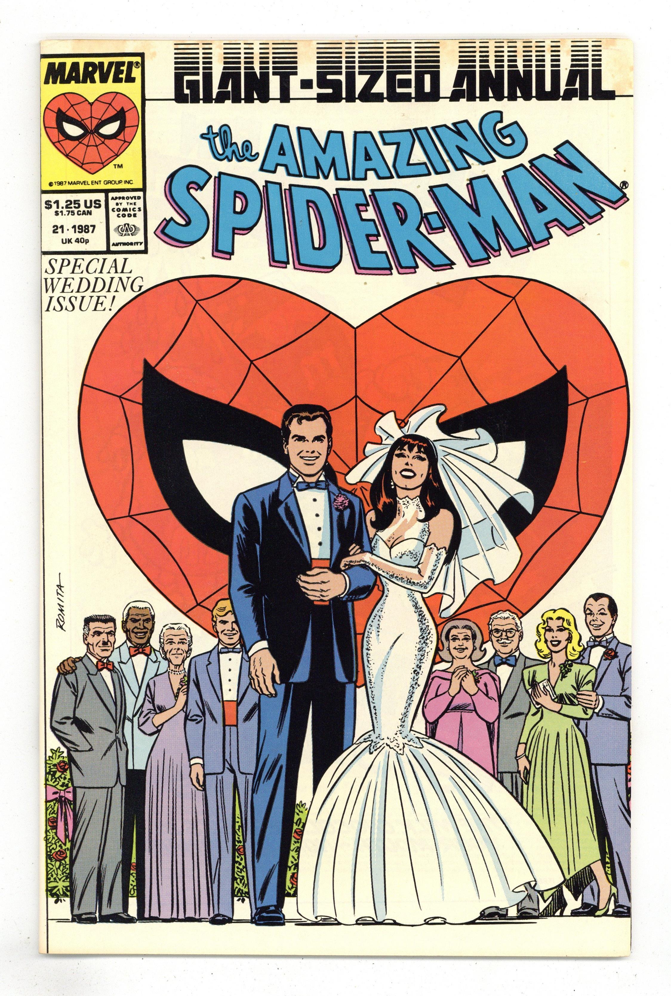Ended Mar 5 2024 Winning Bid $16 Direct Edition. The marriage of Peter Parker and Mary Jane Watson in "The Wedding." Plot by Jim Shooter. Script by David Michelinie. Pencils by Paul Ryan. Inks by Vince Colletta. Cover by John Romita Sr. Direct Edition. At long last wedding bells ring for Peter Parker and Mary Jane Watson! What an exciting day! The blushing bride will need something old, something new, something borrowed, and something blue! While the Amazing Spider-Man will need to take care of two things before the big day! First, the easy task...short circuit Electro's latest scheme! And second, the tough one...put the memory and heartache of Gwen Stacy in the past forever. Will another trip to the Brooklyn Bridge bring peace to the wondrous wall-crawler? Or will the ghosts of days gone by derail a bright future with Mary Jane? Carpe diem, web-slinger! Appearances by Flash Thompson, Harry Osborn, Liz Osborn, Betty Leeds, Aunt May, Anna Watson, Joe Robertson, J. Jonah Jameson, and Willi Smith. Flashback cameos by the Green Goblin, Gwen Stacy, and Uncle Ben. (Notes: Peter and Mary Jane go on their honeymoon in Spectacular Spider-Man Annual 7. The Direct Edition cover features Peter Parker's friends and family. The Newsstand Edition depicts Spider-Man's friends and foes. Amazing Spider-Man Annual 21 was one of the first issues Marvel published with two different covers. This story was reprinted in the 1991 trade paperback: the Amazing Spider-Man - The Wedding.) 52 pages. Cover price $1.25. Grade: FN+ 6.5 explanation of grade Condition: Used (collectible)