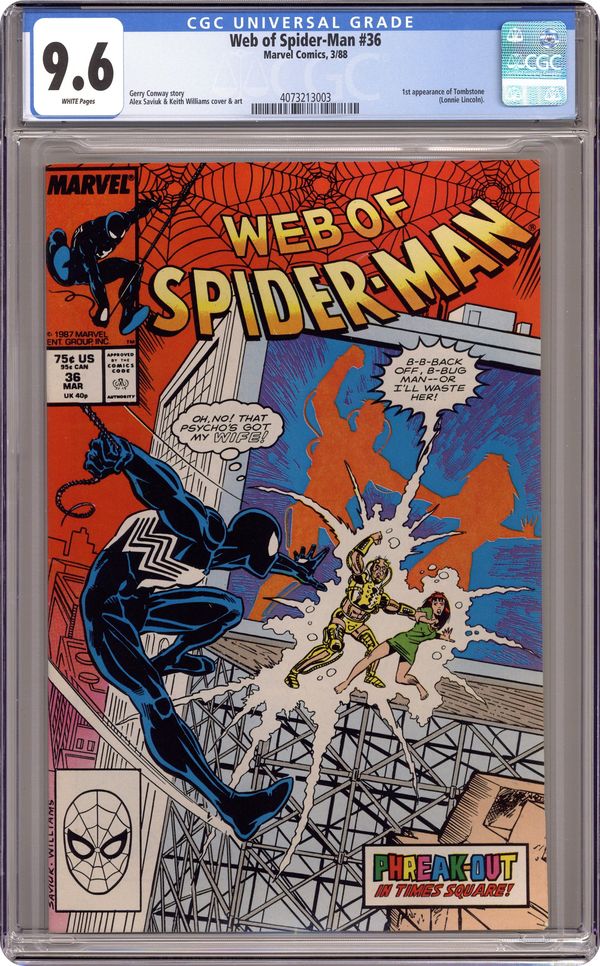 Direct Edition. "Phreak-Out!" Story by Gerry Conway. Art by Alex Saviuk and Keith Williams. The young scientist from the previous issue is still on the loose, and now he has built his own powerful exo-skeleton. The Phreak goes to Peter Parker's apartment and abducts Mary Jane; setting the stage for a showdown with Spider-Man over Times Square! Meanwhile, Joe Robertson is horrified to see a chilling old acquaintance and a soon-to-be new villain for Spider-Man. First appearance of Tombstone. 32 pages Cover price $0.75. Grade: CGC 9.6 explanation of grade Condition: Used (collectible)