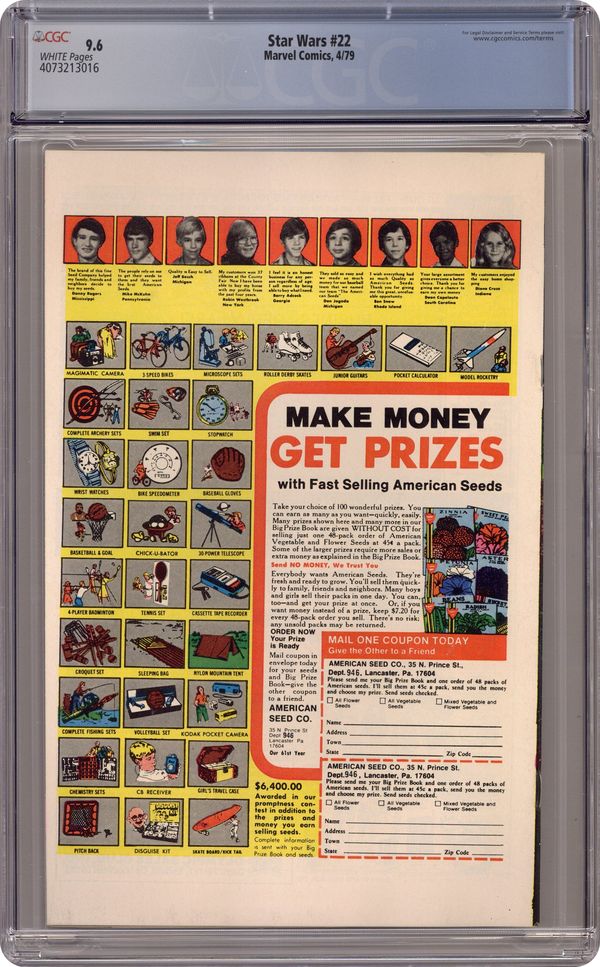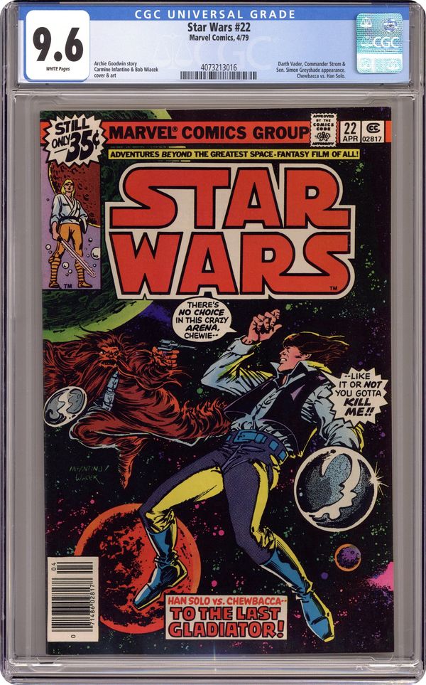 "To the Last Gladiator!" Written by Archie Goodwin. Art by Carmine Infantino and Bob Wiacek. Han Solo and his wookie friend, Chewbacca are forced to fight like space gladiators in an arena of death. But things get even more deadly when the best friends are forced to battle each other to the death. Don't miss the ending that will shock even the most hardened Star Wars fan. Cover price $0.35. Grade: CGC 9.6 explanation of grade Condition: Used (collectible)