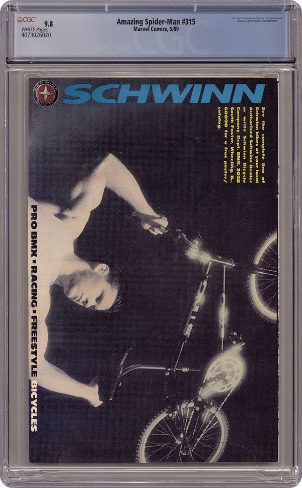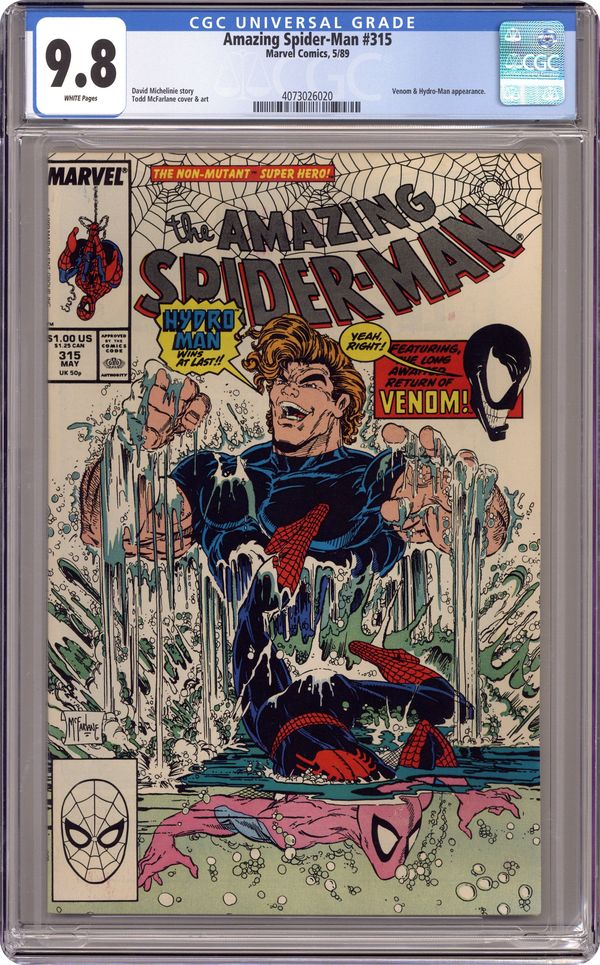 Direct Edition. "A Matter of Life and Debt!" Script by David Michelinie. Art by Todd McFarlane. Cover by Todd McFarlane. Life is full of challenges and on this day Peter Parker and his web-spinning alter-ego face three! The first, Hydro-Man attempts a payday robbery! But the Spectacular Spider-Man stops the heist! The second, Nathan Lubensky steals money from Aunt May to pay his gambling debts! However, Peter quickly shuts down his operation! And the fateful third...Venom escapes from the Vault! Wow, this challenge will be more difficult and more deadly starting next issue! Cameo appearances by Mary Jane Watson and Kristy Watson. (Notes: Venom previously appeared in Amazing Spider-Man 300.) The letters page contains a statement of ownership: average print run 451,930; average paid circulation 271,100. 36 pgs. Cover price $1.00. Grade: CGC 9.8 explanation of grade Condition: Used (collectible)