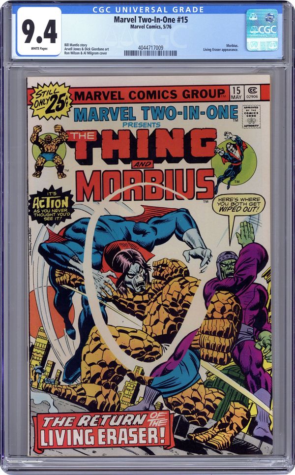 Morbius, the Living Vampire guest stars in "The Return of the Living Eraser!" Script by Bill Mantlo, pencils by Arv Jones, inks by Dick Giordano. Seeking sustenance, Morbius attacks Alicia Masters. Big mistake, for Alicia just so happens to be the girlfriend of one Benjamin J. Grimm, a.k.a. the Thing. And when he catches the macabre creature hassling his squeeze, well... "It's Clobberin' Time!" Plus, witness the return of the alien villain called the Living Eraser (last seen in Tales to Astonish # 49). Letters to the editor from comics writer Ralph Macchio and writer Paul Dini (animated Batman; Lost). The letters page also includes Marvel Value Stamp series B # 79, upper right corner of the Silver Surfer by Jack Kirby. Spider-Man stars in a oneppage Hostess ad, "The Twinkie Takers." Ron Wilson cover pencils, Al Milgrom cover inks. Cover price $0.25. Grade: CGC 9.4 explanation of grade Condition: Used (collectible)