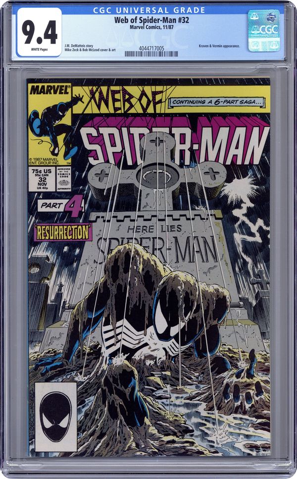 Direct Edition. Kraven's Last Hunt - Part 4 of 6 - "Resurrection" Story by J. M. DeMatteis. Art by Mike Zeck and Bob McLeod. Story continues from Spectacular Spiderman 131. Spider-Man finally awakens from his drug-induced coma and busts out of his coffin! Peter quickly returns to his wife, Mary Jane, who has not seen him in two weeks. Meanwhile, Kraven has been committing crimes in New York City, while dressed as Spider-Man. Story continues in Amazing Spiderman 294. Cover price $0.75. Grade: CGC 9.4 explanation of grade Condition: Used (collectible)