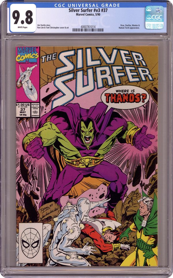 Infinity Gauntlet: Prelude - Rebirth of Thanos: Part 4 of 5 - "A Destructive Encounter!" Guest-starring Starfox and Drax the Destroyer. Story by Jim Starlin. Art by Ron Lim and Tom Christopher. With the threat of Thanos in the universe, the titan Chronos has activated his agent Drax the Destroyer again. However, when Drax was murdered by Moondragon his brain was severely damaged, a condition that has apparently carried over to his resurrection. Can the Silver Surfer reason with the powerhouse and reach the Mad Titan before it's too late? 32 pages. Cover price $1.00. Grade: CGC 9.8 explanation of grade Condition: Used (collectible)