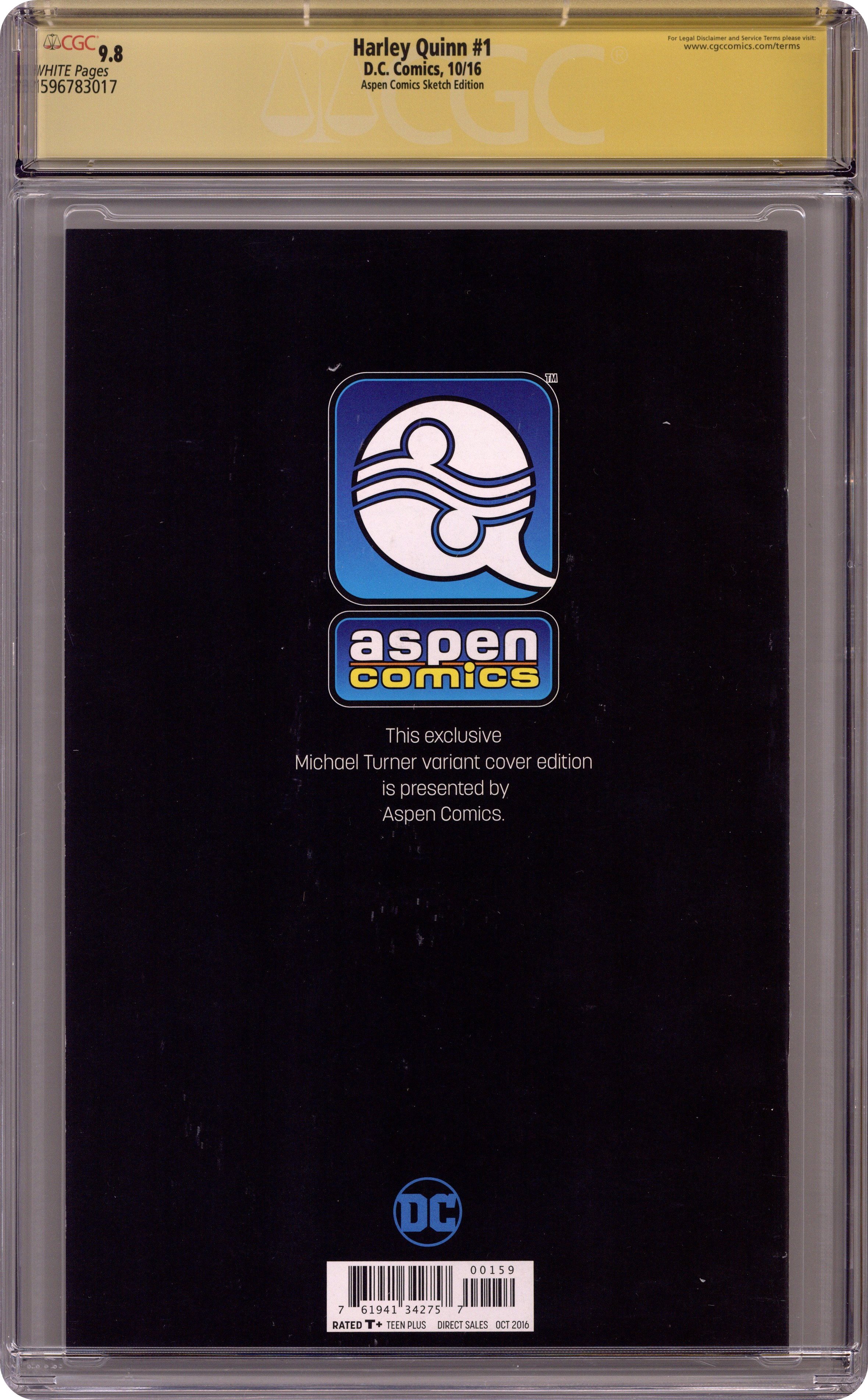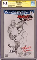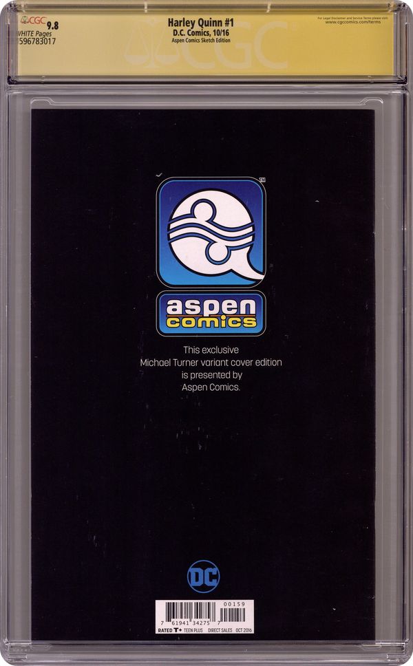 Aspen Comics Variant. Cover by Michael Turner. DC Universe Rebirth - Die Laughing: Part 1 of 3 - Written by Amanda Conner and Jimmy Palmiotti. Art by Chad Hardin. 'Die Laughing' part one! Welcome back to Harley Quinn's crazy world on Coney Island…now get ready to wave goodbye, because everyone there just might get eaten alive! Harley's gotta protect her neighborhood against an all-out zombie apocalypse! Break out the chainsaws, everybody! 32 pages, full color. Rated T+ Grade: CGC 9.8 explanation of grade Condition: Used (collectible)